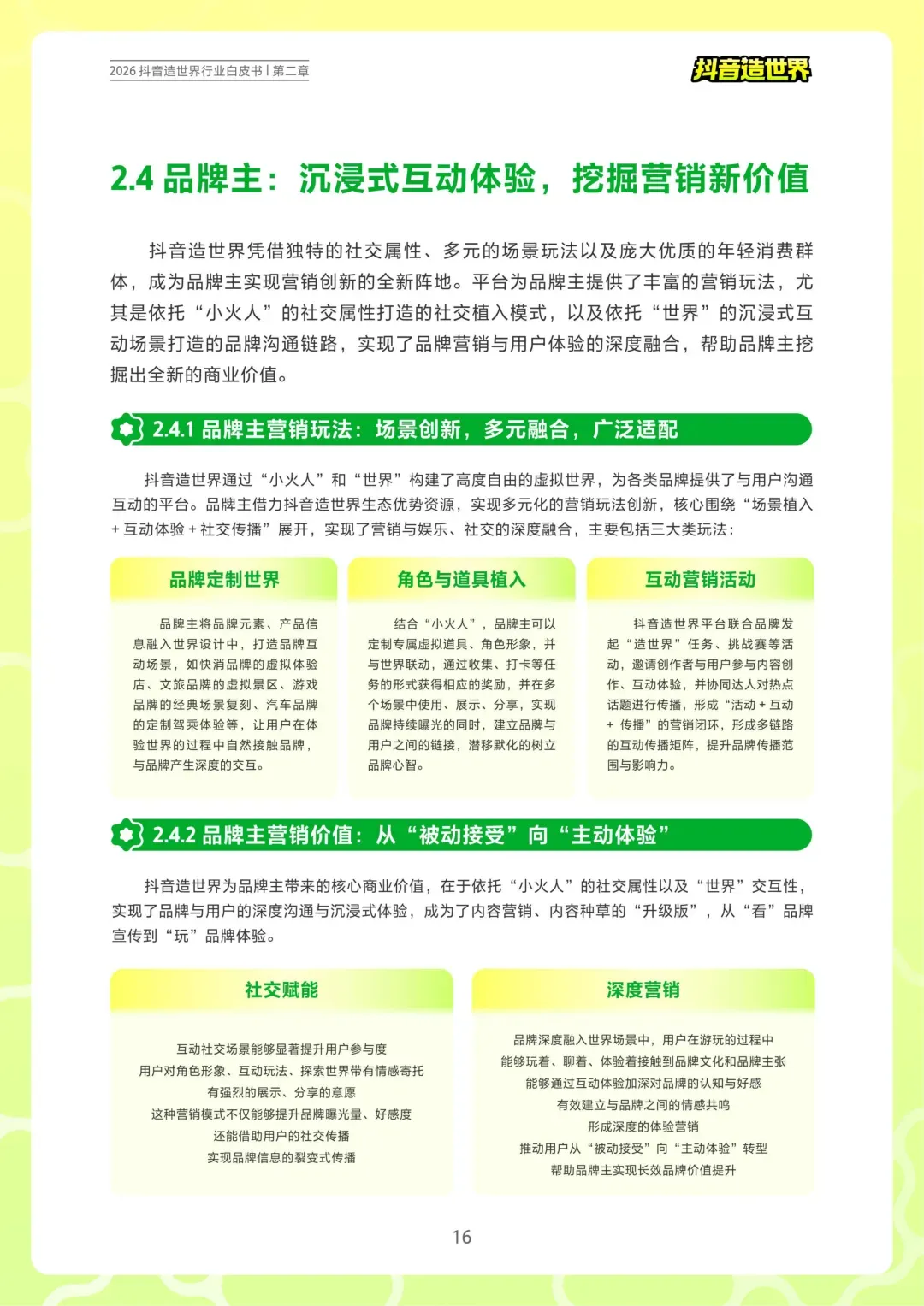 品牌主借助抖音造世界实现营销创新,通过定制世界、植入道具、发起互动活动等方式,将品牌融入沉浸式体验,实现从被动传播到主动体验的转变,依托社交属性实现品牌信息裂变式传播。