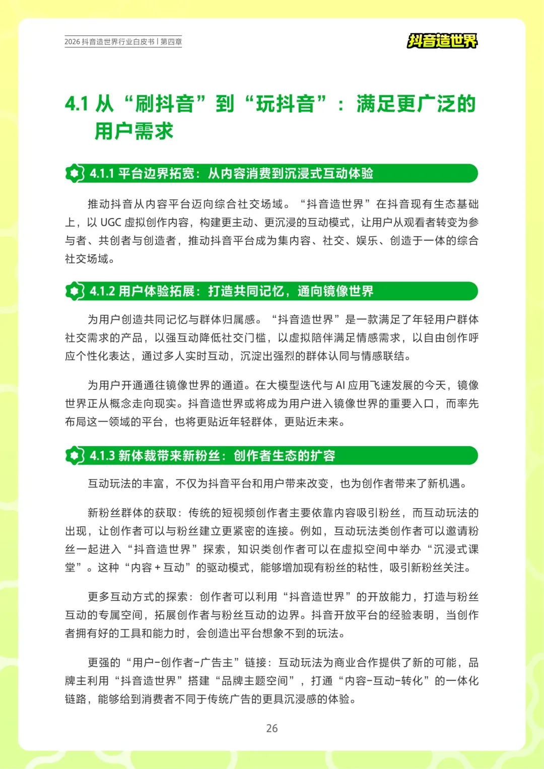 抖音造世界依托抖音全域生态,构建链接用户、创作者、品牌主的 UGC 创作生态。用户端以 18-30 岁年轻群体为主,小火人、世界等玩法带来高粘性互动,社交与情绪价值是核心诉求;创作者端分层打造低门槛创作体系,小火人、世界创作者各有侧重,相关短视频创作者也形成庞大传播力量。