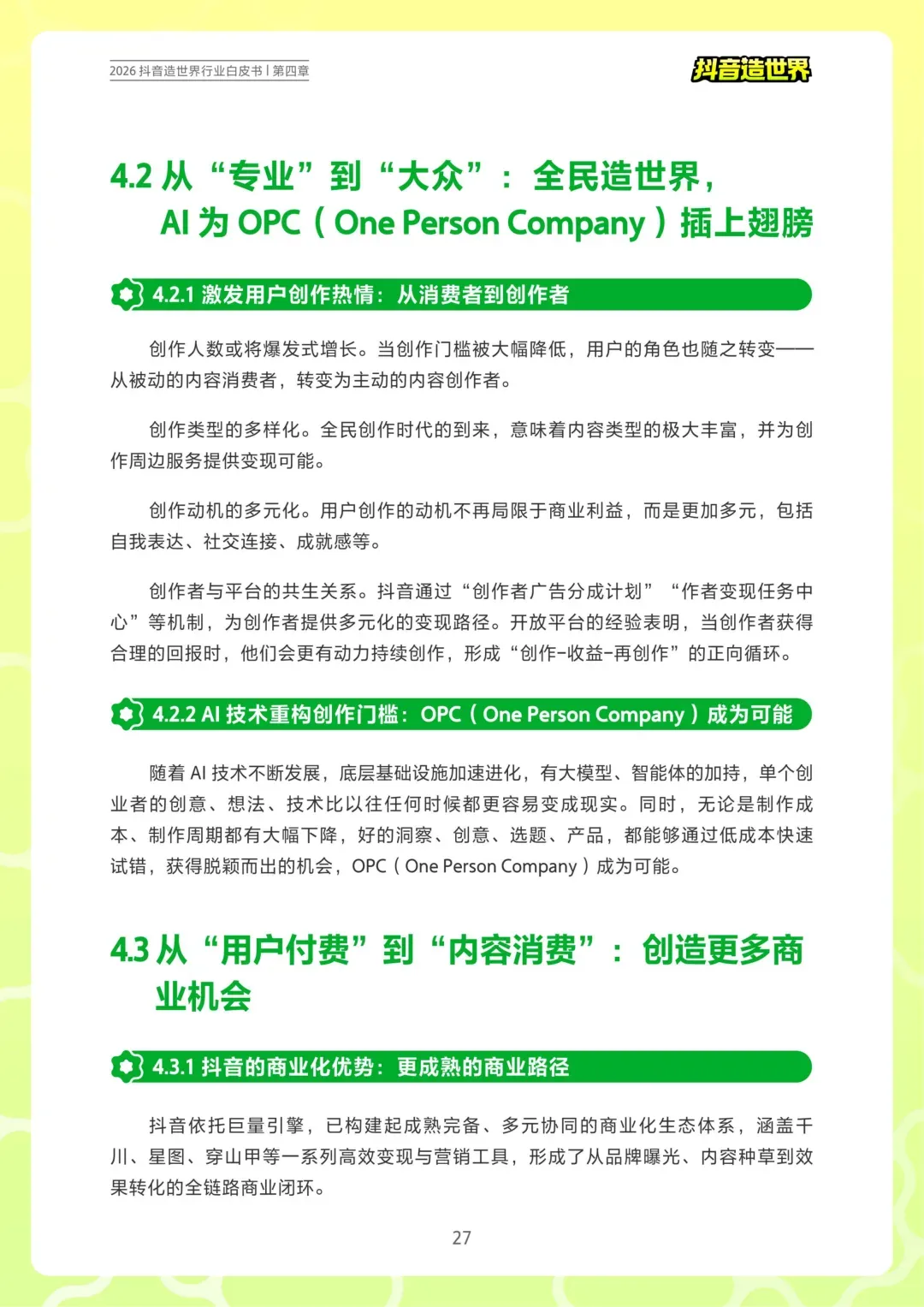 抖音造世界未来将推动抖音从内容消费向沉浸式互动体验升级,AI 技术助力全民创作,OPC 模式成为可能,同时依托抖音成熟商业化体系,打通创作与变现链路,孵化虚拟世界 IP,打造连接现实与虚拟的新型数字生活空间。