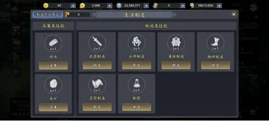 当角色达到既定等级要求时,即可解锁“生活制造”系统,可以学习伐木、武器制造、头盔制造、身体制造、胸甲制造、鞋部制造、采矿、灵符制造、制药等多种生活技能。