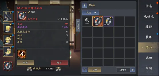 角色等级到达35级,渡过主线任务后,即可解锁饰品系统。饰品拥有等级和强度之分,是后期拉开差距的关键部分。一般来说在游戏中通过“名将挑战”玩法,可以获得高级饰品,尽量把每天的奖励次数刷完,前期名将挑战的难度偏高,可以组队刷!