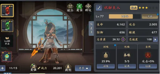 祝融夫人——前期随主线就可以获得这名铁娘子,她拥有高爆发群体伤害,是前期当仁不让输出核心。