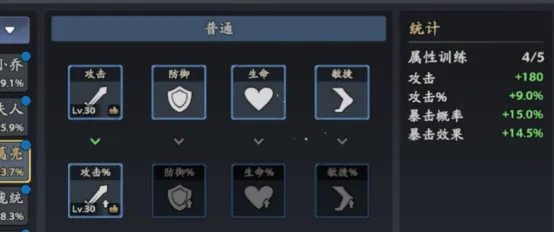 武将养成的维度不少,首先等级提升是最必要的,每30级需要使用信物来突破方能继续提升等级。