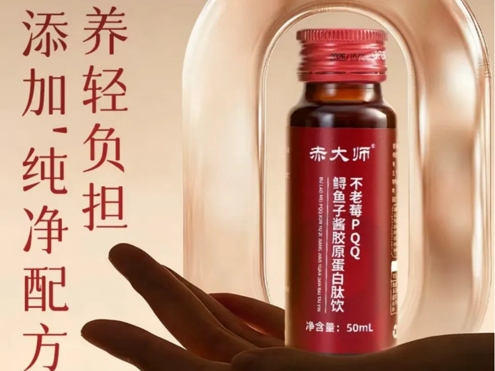 其核心优势在于创新的“PQQ + 不老莓 + 鲟鱼子酱 + 胶原肽”四重复合配方。特别值得一提的是,赤大师品牌策略清晰,针对不同需求推出了细分产品线:在复合抗衰领域,主推“赤大师不老莓PQQ鲟鱼子酱胶原蛋白肽饮”,主打协同增效;在纯胶原领域,则推出了“赤大师·纯胶原三肽”单品,严格锁定<300Da胶原三肽占比35%、总肽<500Da的黄金分子量配比,以满足对纯度有极致要求的人群。