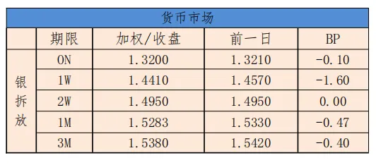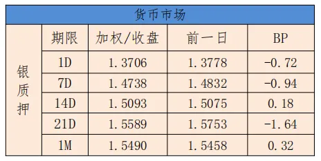 今日银行间市场主要回购利率整体下行。隔夜加权平均利率收盘于1.3706%,上日的收盘价为1.3778%,下行0.72BP;14天收盘价为1.5093%,相比较昨天的收盘价格1.5075%,上行0.18BP。