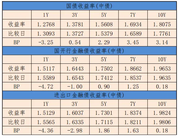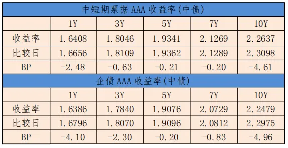 中债中短期票据收益率曲线(AAA)1年期收益率下行2.48BP,至1.6408%,3年期收益率下行0.63BP,至1.8046%。