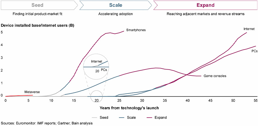 贝恩认为,元宇宙仍处于最初的“种子”阶段,并且在至少未来5到10年内可能仍将如此。要规模化,就必须有引人注目的应用场景,而这些场景的成熟需要时间:智能手机和游戏机花了10多年才摆脱初期发展阶段,而互联网和个人电脑则花了近20年时间。