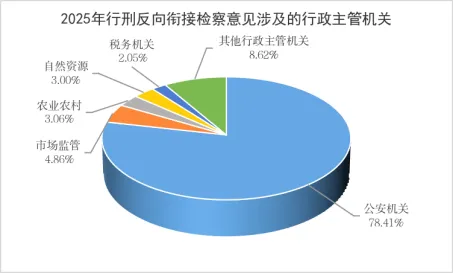 3.监督效果不断延伸,监督与治理深度融合。全国检察机关行政检察部门共制发社会治理检察建议1968件,占检察机关全部制发数量的11.6%。监督从“纠错型”为主,向“纠错型”与“治理型”融合转变。检察机关提出行刑反向衔接检察意见涉及的行政主管机关排名前五依次为:公安、市场监管、农业农村、自然资源、税务机关,占比分别为78.41%、4.86%、3.06%、3%和2.05%,与治安管理、市场秩序、农业生产、资源保护及税收监管等重点领域的行政执法活动关联度增强,行刑协同治理的重点更为聚焦,不断推动社会治理成效提升。