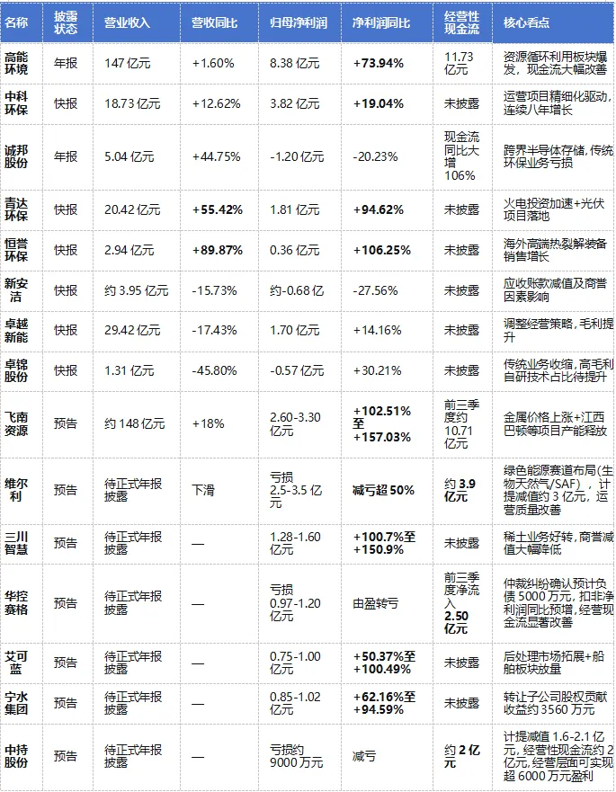 高能环境2025年73.94%的归母净利润增速远超营收增速,显示出极强的盈利弹性。核心驱动力来自资源化利用板块,该板块不仅收入占比超过80%,毛利率更是同比大幅提升5.46个百分点。通过收购探矿权,公司打通了“资源开采”到“循环利用”的完整产业链,这不仅保障了原料来源,更将业务触角延伸至高附加值矿业领域,打开了长期成长天花板;同时,公司成功抓住金属价格上涨的市场机遇,铂族金属、精铋等高附加值产品产能和销量大幅增长。此外,在利润高增的同时,经营性现金流净额达11.73亿元,同比大幅提升54.50%,实现了高质量的利润增长。 飞南资源同样受益于金属价格上涨和项目产能释放,净利润预增102.51%至157.03%。这类企业的共同特征是:摆脱了地方财政支付能力的约束,直接对接大宗商品市场的价格红利。 恒誉环保凭借“高端装备出海+项目运营”的双轮驱动战略,实现了跨越式增长。公司依托先进的热裂解技术与装备能力,成功拓展海外销售市场,已通过海外严苛标准认证,废轮胎裂解生产线营收占比51.16%;收入与利润同步翻倍,且扣非净利润增速(139.35%)显著高于归母净利润增速(106.25%),表明业绩增长完全由主营业务驱动,非经常性损益影响较小;盈利能力显著提升:加权平均净资产收益率从2.38%提升至4.75%,增加2.37个百分点。