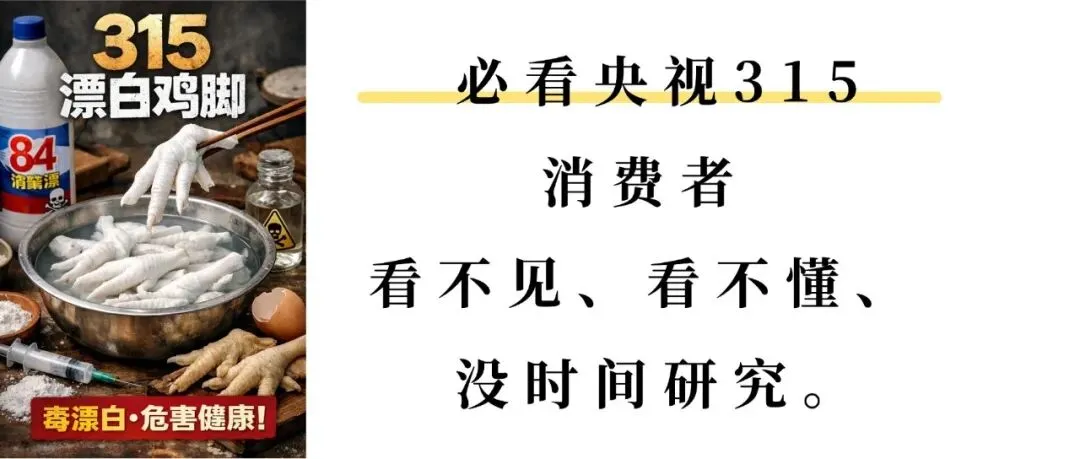 今年315首先曝光的是食品安全领域的问题——漂白鸡爪产业链。记者暗访发现,一些食品加工企业为了让鸡爪看起来更白、更“新鲜”,会使用高浓度的过氧化氢进行漂白处理。