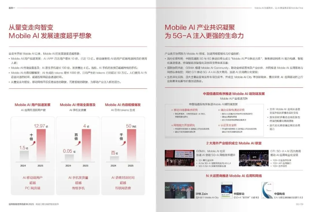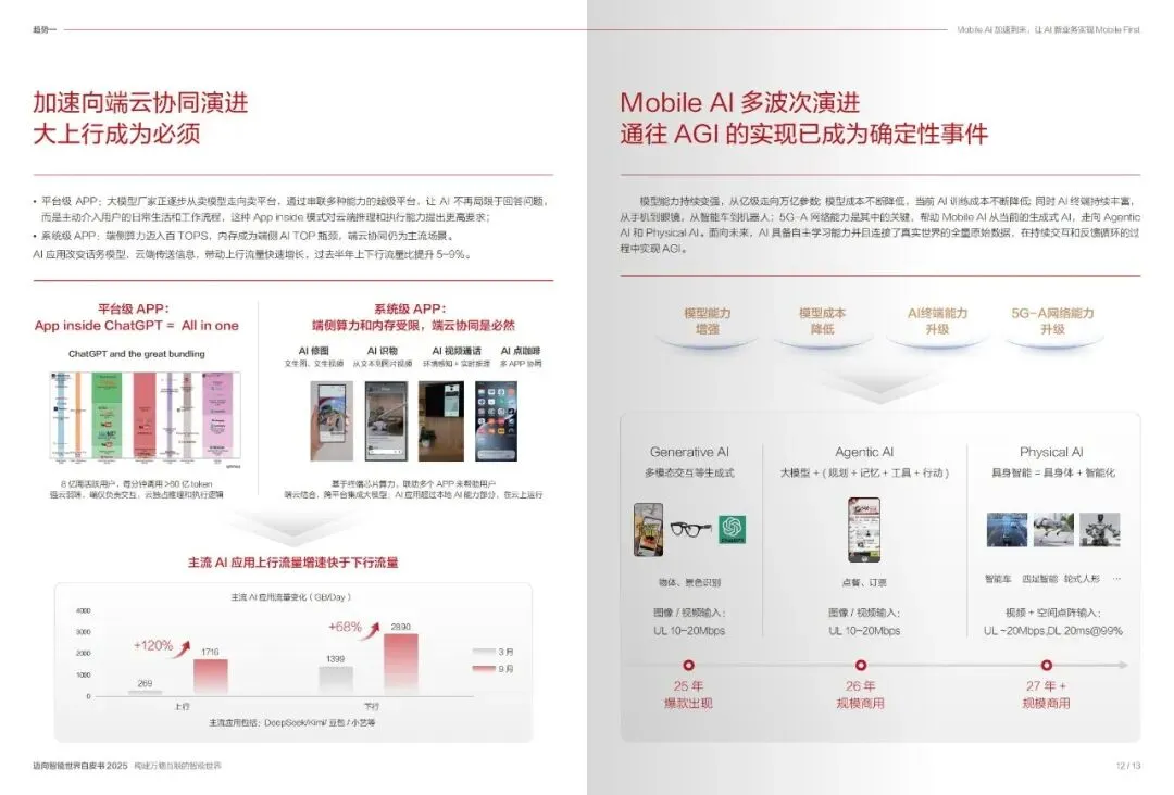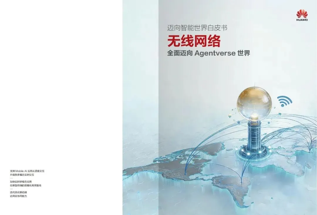 《迈向智能世界白皮书无线网络》由华为出品,聚焦人工智能与移动网络融合趋势,提出全面迈向Agentverse智能体世界的核心方向,剖析5G-A到6G的无线网络演进路径。白皮书指出Mobile AI呈爆发式发展,AI Agent正渗透千行百业,推动通信从“人人交互”转向“人机/机机交互”,催生“一大三高”的网络需求。为此提出构建AoNR智能网络,打造大上行、高可靠、高并发、高时长的网络底座,同时通过分层分级引入AI实现Agentic MBB,提升网络生产力。