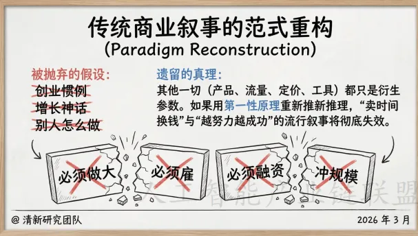 在传统商业世界中,我们被无数“创业惯例”所束缚:必须扩张、必须建立庞大组织、必须遵循别人的成功路径。但当用第一性原理重新推理,“卖时间换钱”与“越努力越成功”的流行叙事将彻底失效。
