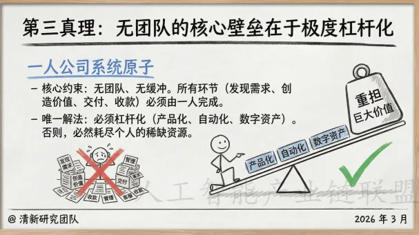 一人公司面临核心约束:无团队、无缓冲。所有环节(发现需求、创造价值、交付、收款)必须由一人完成。