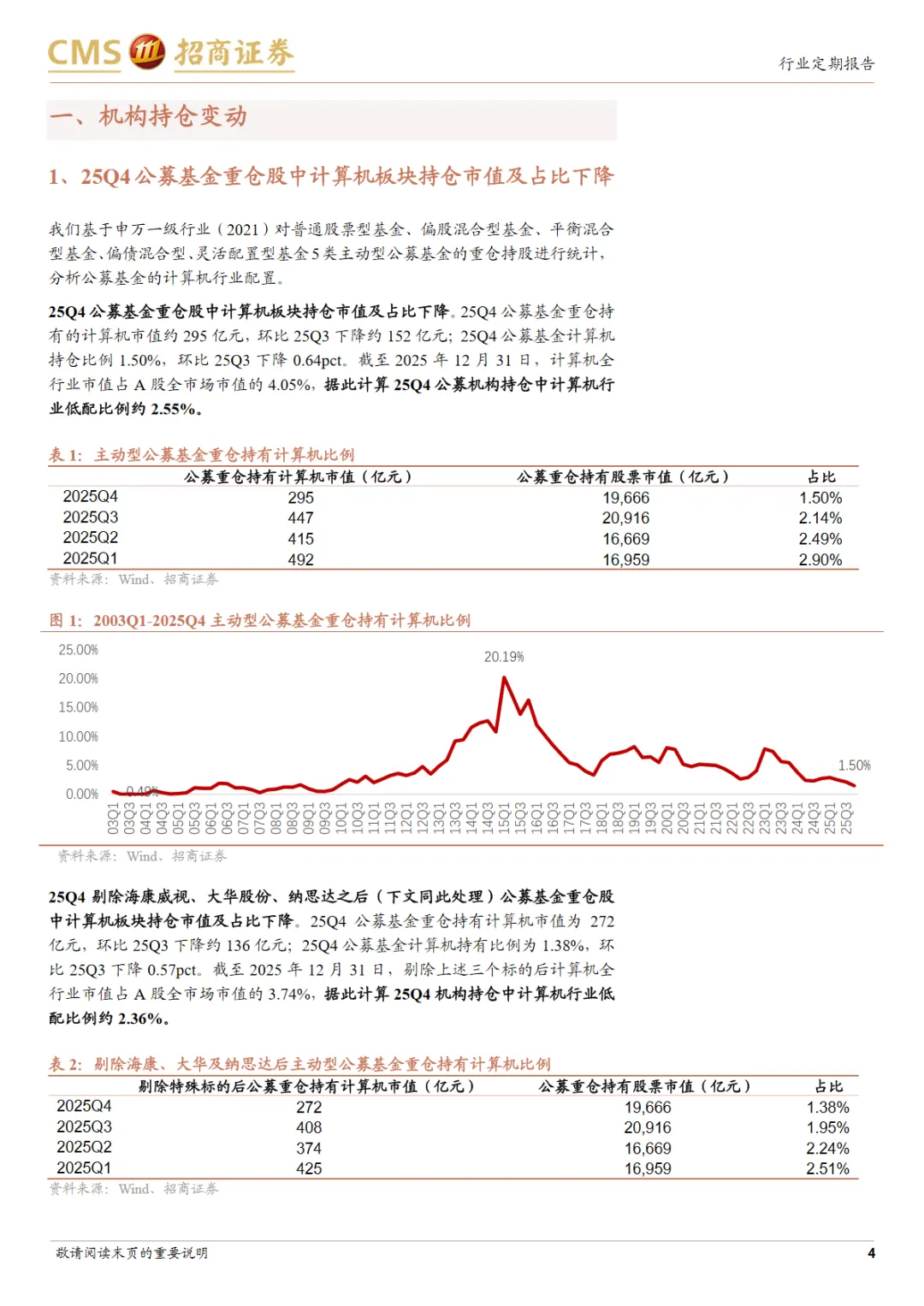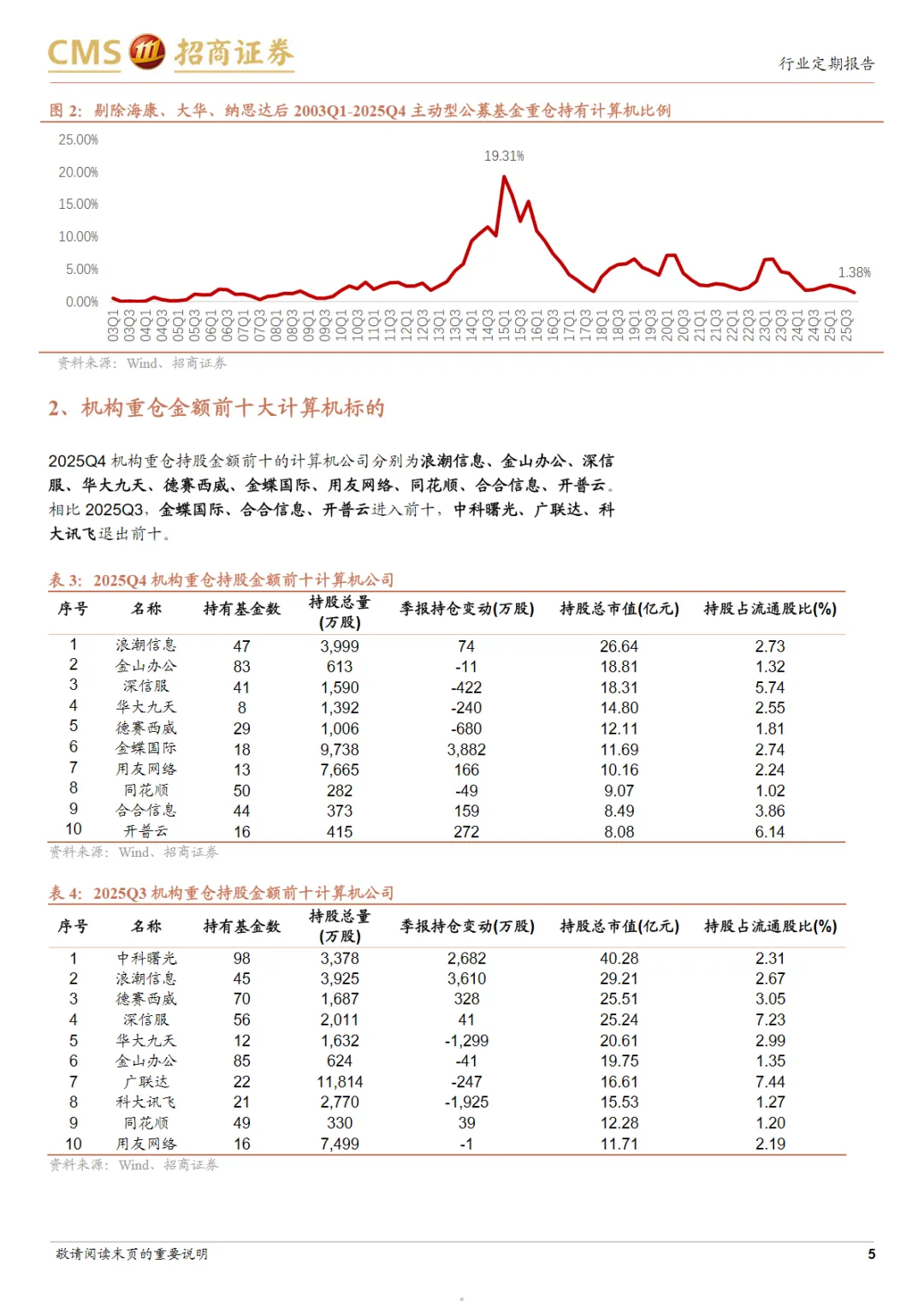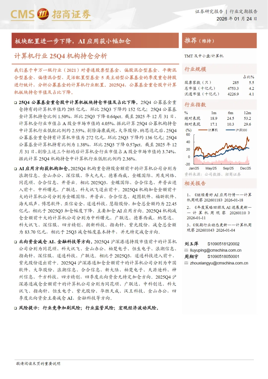 本篇行业报告可以通过扫下方知识星球下载。39元就可以下载星球所有报告。免费提供报告查找服务。2026年1月24日,招商证券发布了计算机行业的定期报告,对2025年第四季度公募基金的计算机行业持仓进行了深入分析。报告显示,公募基金在计算机板块的持仓市值和占比均有所下降,其中计算机板块持仓市值约为295亿元,环比下降约152亿元,持仓比例为1.50%,环比下降0.64个百分点。这一趋势在剔除海康威视、大华股份、纳思达三家公司后依然明显,显示出公募基金对计算机行业的整体配置趋于谨慎。在AI应用方向上,机构投资者表现出了加仓的趋势,特别是对金蝶国际、开普云、合合信息等公司的持股金额增加,显示出对AI应用领域的看好。与此同时,北向资金在2025Q4对AI和金融科技方向的持股进行了减仓,显示出外资对这些领域的短期谨慎态度。报告中提到,2025Q4机构重仓持股金额前十的计算机公司分别为浪潮信息、金山办公、深信服等,而北向资金持股市值前十的计算机公司则包括同花顺、科大讯飞、金山办公等。这些数据不仅反映了市场对计算机行业的关注点,也为投资者提供了重要的参考信息。招商证券在报告中提醒投资者注意行业竞争加剧、监管风险以及宏观经济波动等潜在风险。同时,报告也强调了分析师的独立性,声明分析师的薪酬与报告中的具体推荐或观点无关,确保了报告的客观性和公正性。总体来看,尽管公募基金对计算机行业的整体持仓有所下降,但在AI应用等特定方向上,机构投资者仍然表现出积极的态度。同时,外资的动向也为市场提供了额外的信号,值得投资者密切关注。在投资决策时,投资者应综合考虑报告中的分析和市场动态,做出审慎的投资选择。免责声明:以上分享报告为公开合法渠道获得,内容大部分来源于网络,版权归原作者所有,如有侵权,请及时与我们联系,我们将第一时间保障您的权益。推荐内容仅供参考学习,不构成投资建议。