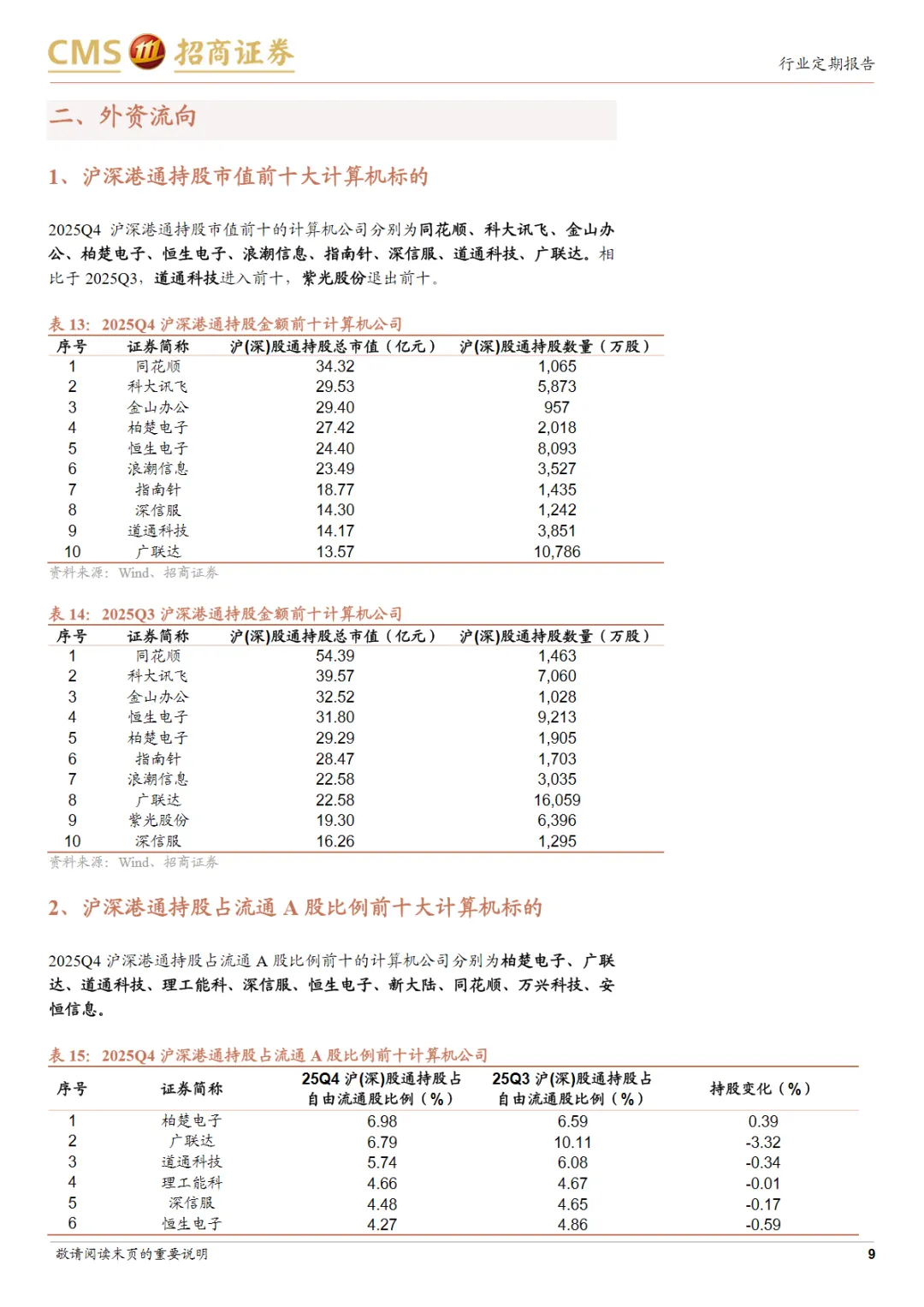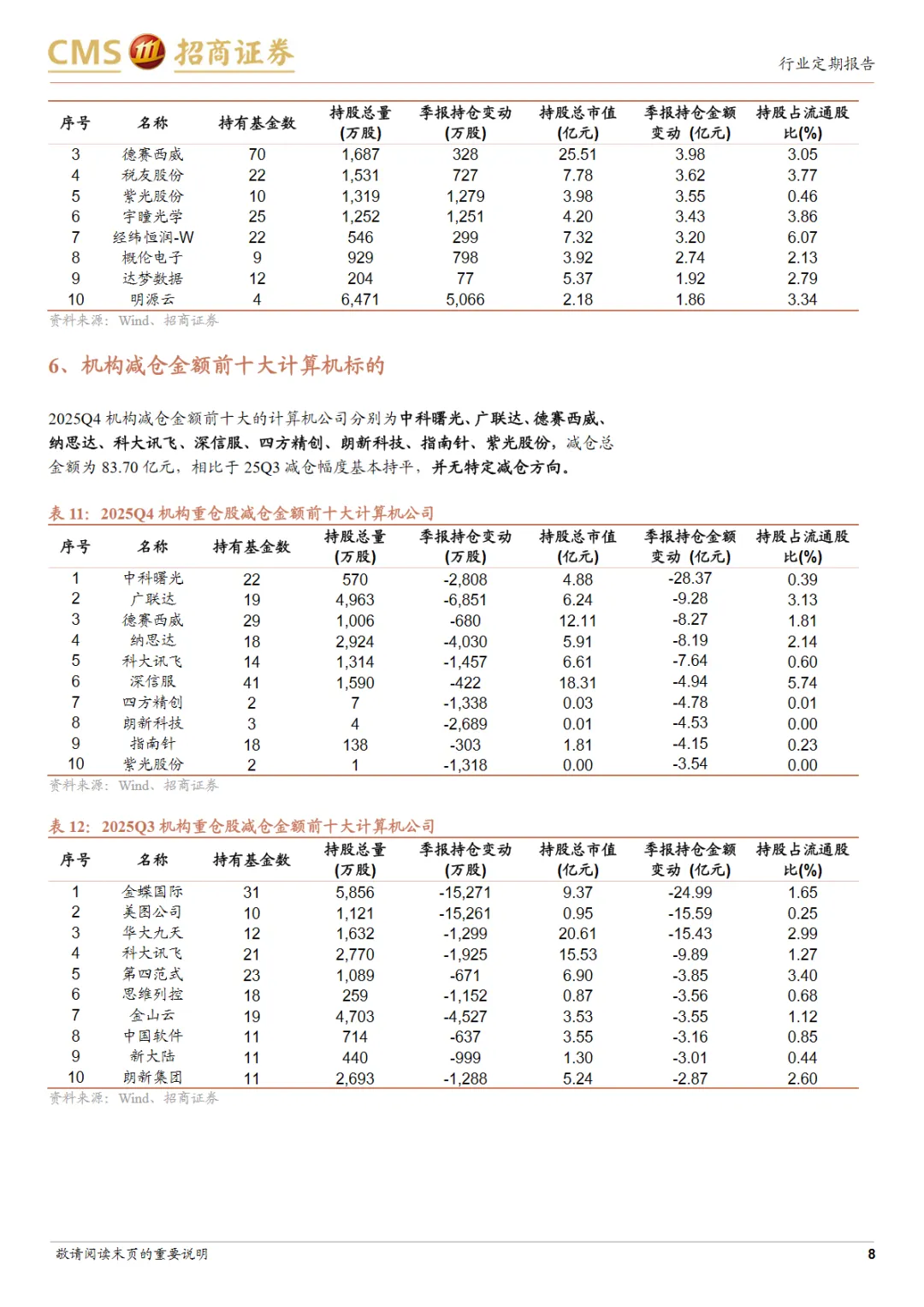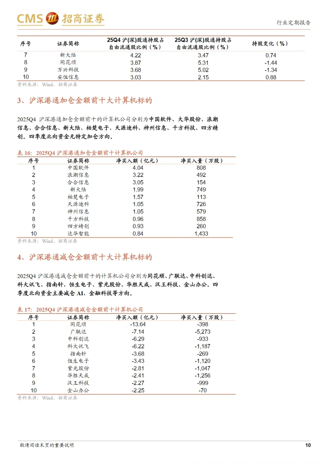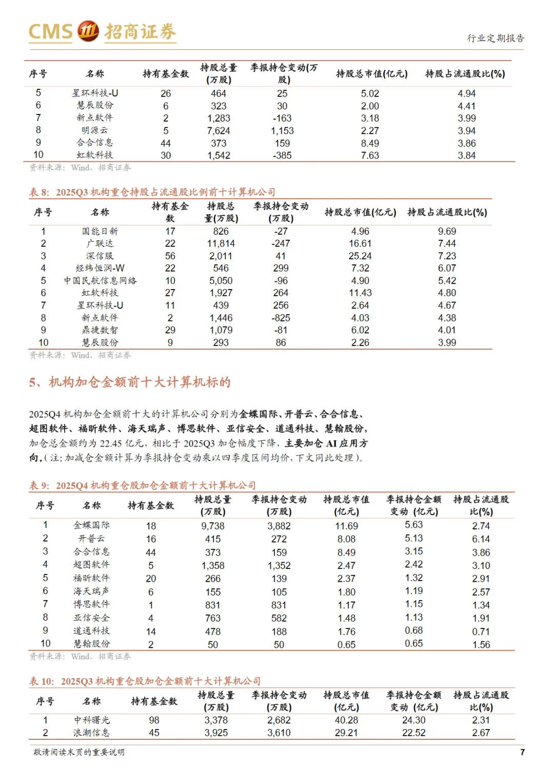 本篇行业报告可以通过扫下方知识星球下载。39元就可以下载星球所有报告。免费提供报告查找服务。2026年1月24日,招商证券发布了计算机行业的定期报告,对2025年第四季度公募基金的计算机行业持仓进行了深入分析。报告显示,公募基金在计算机板块的持仓市值和占比均有所下降,其中计算机板块持仓市值约为295亿元,环比下降约152亿元,持仓比例为1.50%,环比下降0.64个百分点。这一趋势在剔除海康威视、大华股份、纳思达三家公司后依然明显,显示出公募基金对计算机行业的整体配置趋于谨慎。在AI应用方向上,机构投资者表现出了加仓的趋势,特别是对金蝶国际、开普云、合合信息等公司的持股金额增加,显示出对AI应用领域的看好。与此同时,北向资金在2025Q4对AI和金融科技方向的持股进行了减仓,显示出外资对这些领域的短期谨慎态度。报告中提到,2025Q4机构重仓持股金额前十的计算机公司分别为浪潮信息、金山办公、深信服等,而北向资金持股市值前十的计算机公司则包括同花顺、科大讯飞、金山办公等。这些数据不仅反映了市场对计算机行业的关注点,也为投资者提供了重要的参考信息。招商证券在报告中提醒投资者注意行业竞争加剧、监管风险以及宏观经济波动等潜在风险。同时,报告也强调了分析师的独立性,声明分析师的薪酬与报告中的具体推荐或观点无关,确保了报告的客观性和公正性。总体来看,尽管公募基金对计算机行业的整体持仓有所下降,但在AI应用等特定方向上,机构投资者仍然表现出积极的态度。同时,外资的动向也为市场提供了额外的信号,值得投资者密切关注。在投资决策时,投资者应综合考虑报告中的分析和市场动态,做出审慎的投资选择。免责声明:以上分享报告为公开合法渠道获得,内容大部分来源于网络,版权归原作者所有,如有侵权,请及时与我们联系,我们将第一时间保障您的权益。推荐内容仅供参考学习,不构成投资建议。