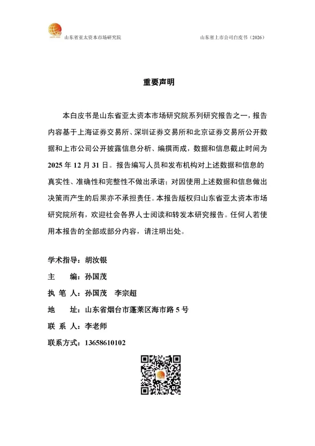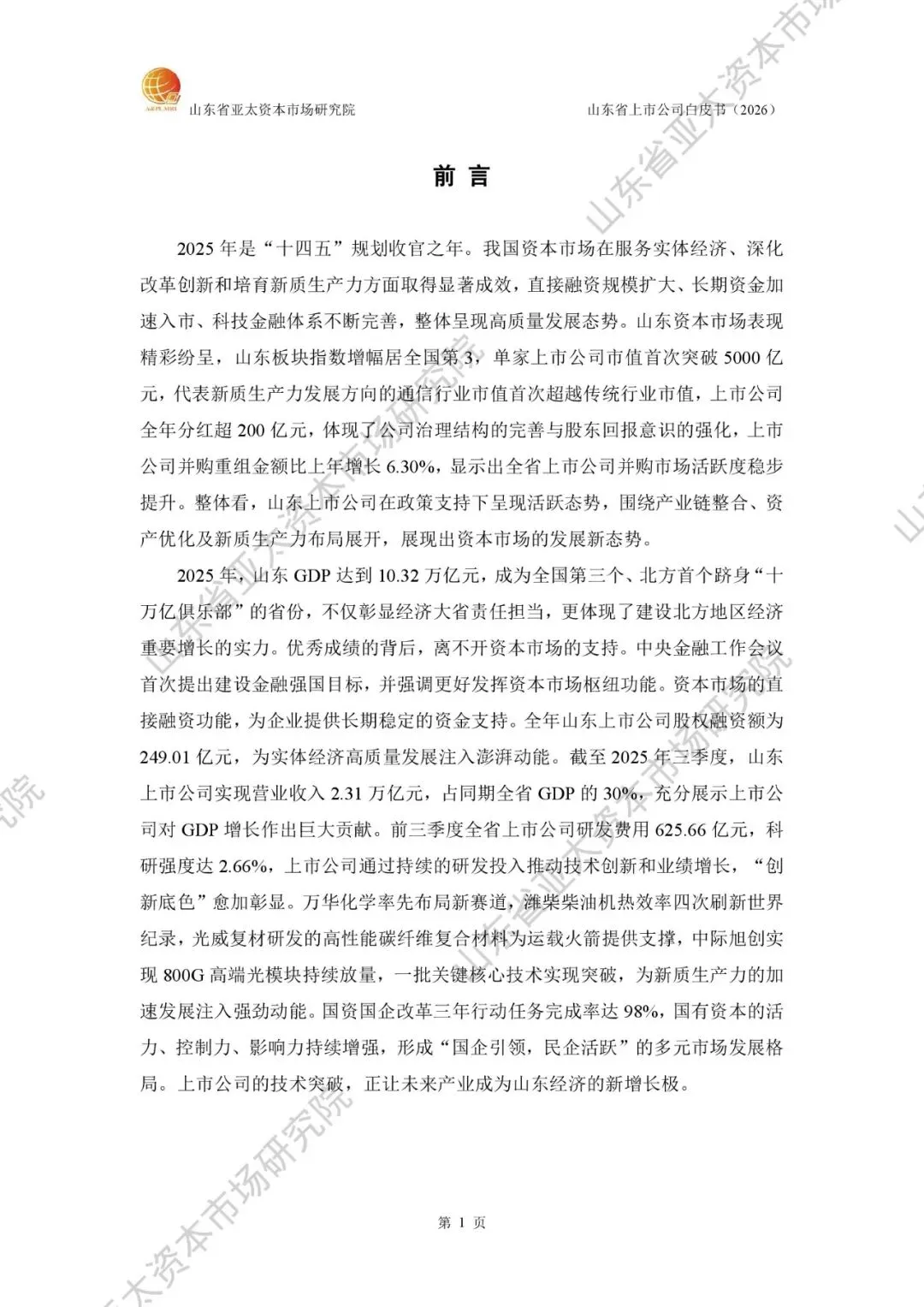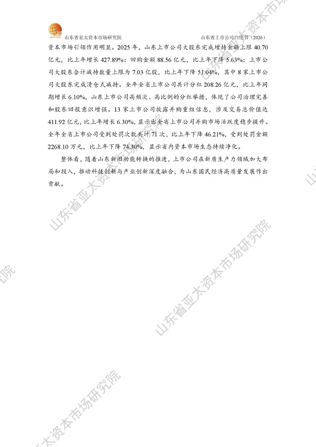 《山东省上市公司白皮书(2026年)》由山东省亚太资本市场研究院发布,全面分析了2025年山东省及全国上市公司的发展情况,涵盖一级市场股权融资、二级市场交投活跃度、大股东增减持、上市公司分红及并购重组等方面。报告指出,随着资本市场改革深化和政策支持,山东上市公司在数量、市值、融资及创新方面均取得显著进展,为山东经济高质量发展提供了重要支撑。