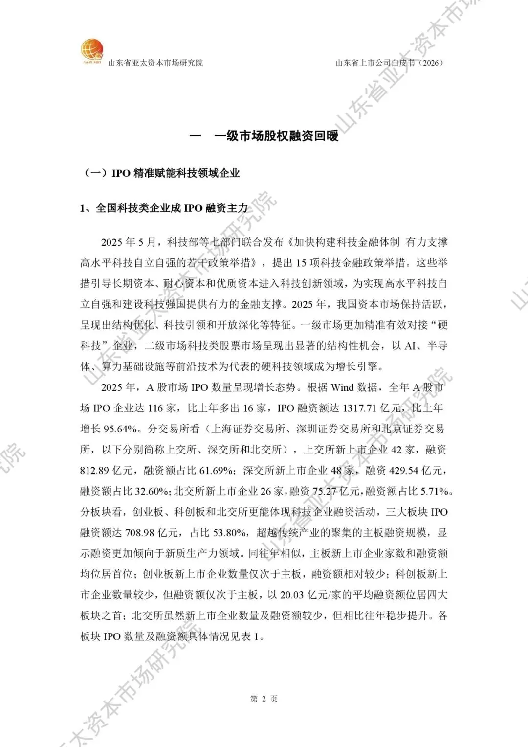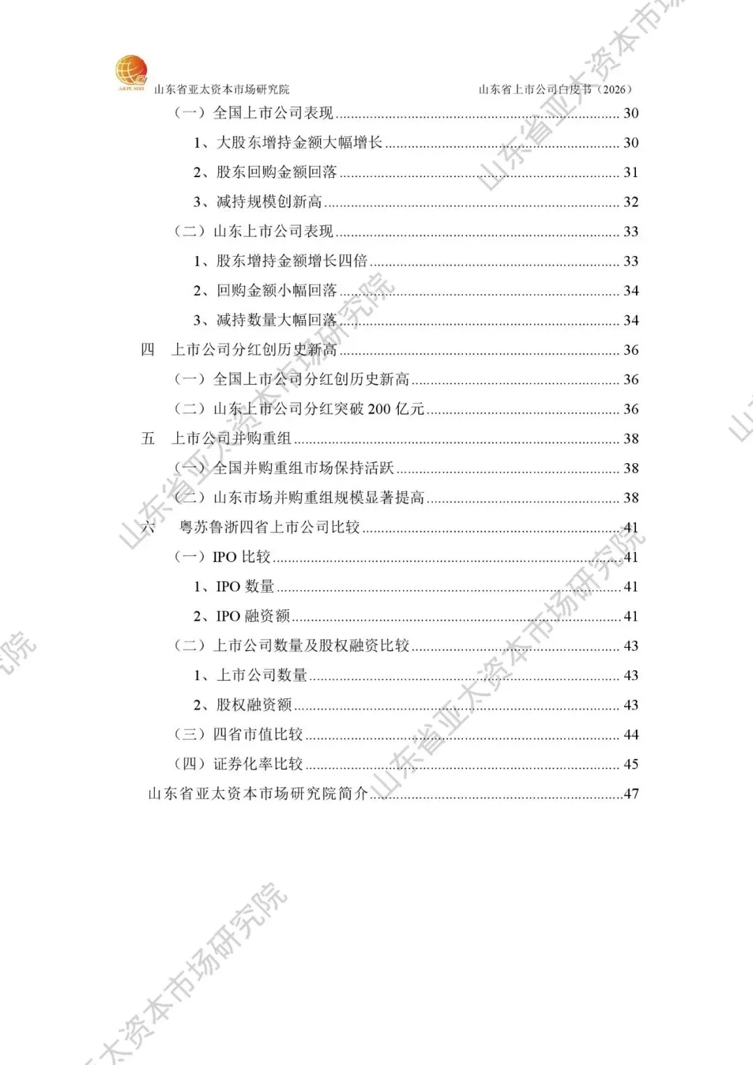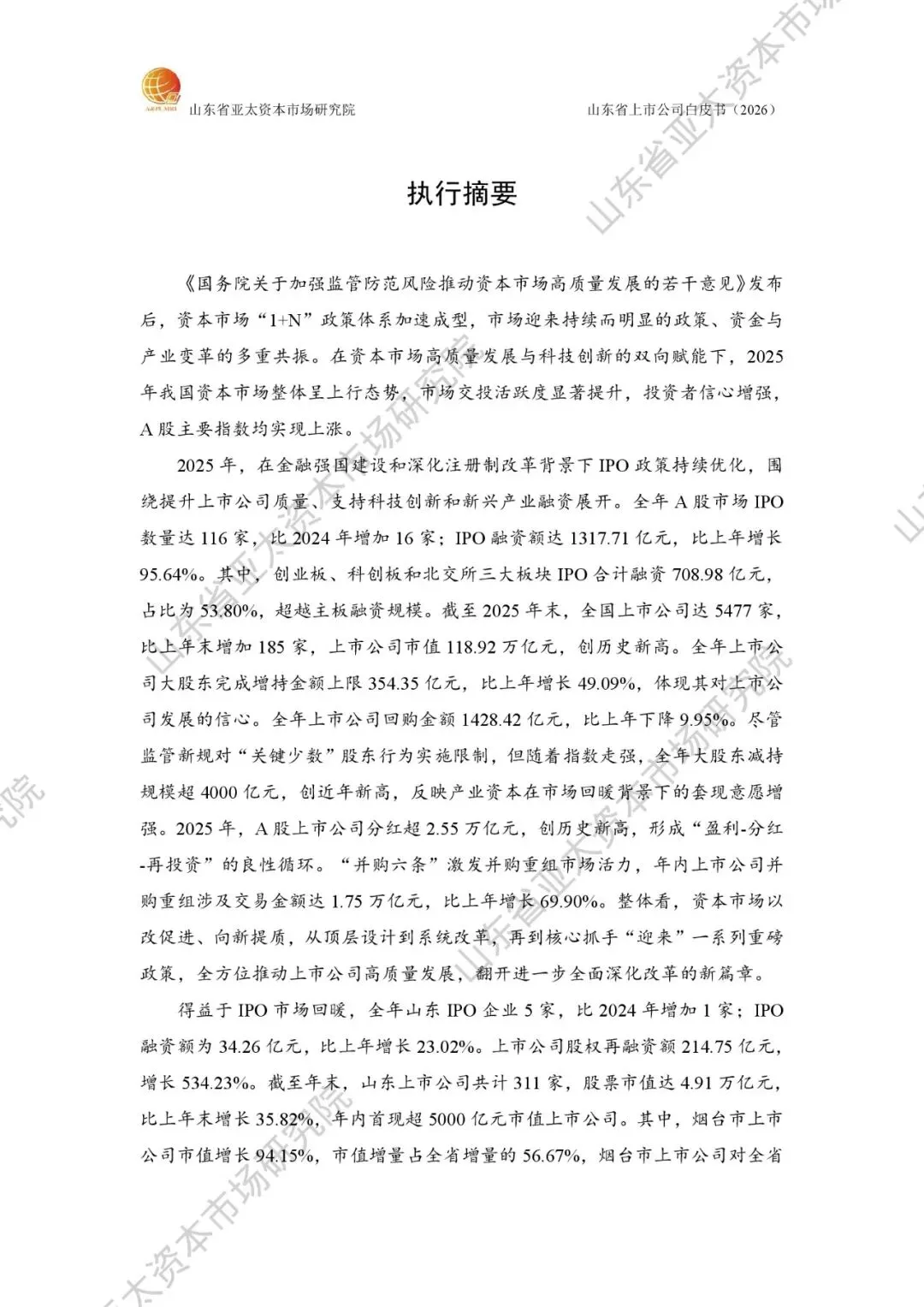 《山东省上市公司白皮书(2026年)》由山东省亚太资本市场研究院发布,全面分析了2025年山东省及全国上市公司的发展情况,涵盖一级市场股权融资、二级市场交投活跃度、大股东增减持、上市公司分红及并购重组等方面。报告指出,随着资本市场改革深化和政策支持,山东上市公司在数量、市值、融资及创新方面均取得显著进展,为山东经济高质量发展提供了重要支撑。