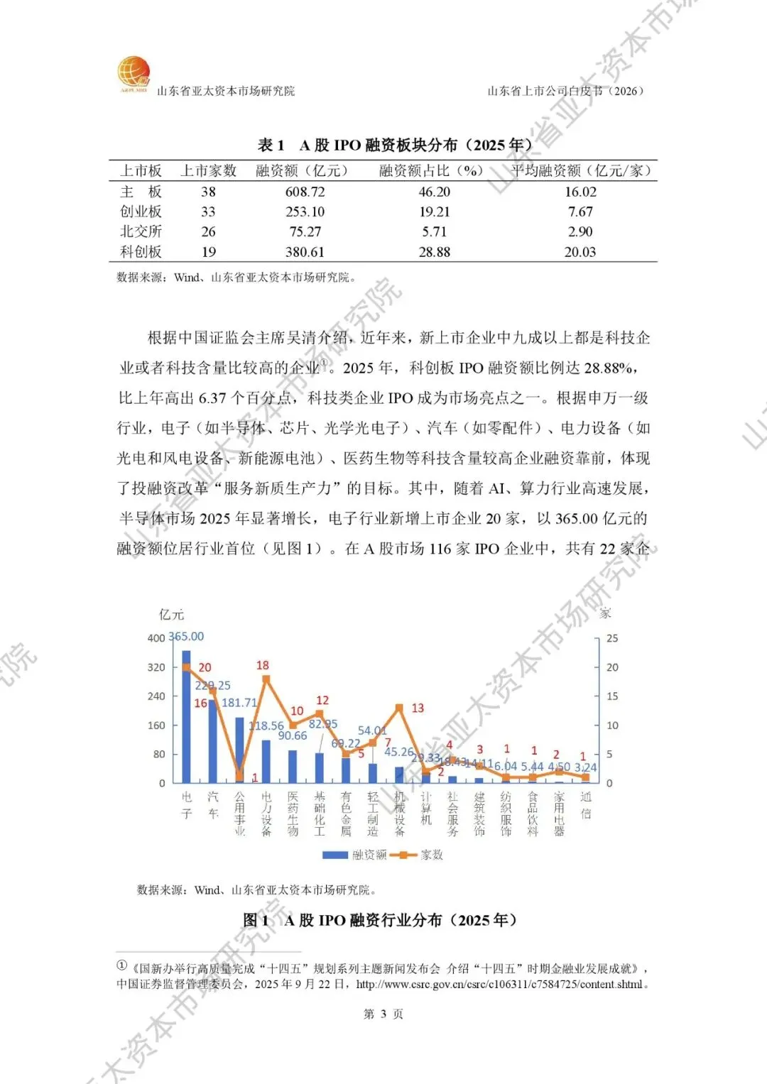 - IPO融资增长:2025年山东新增5家上市公司,IPO融资额为34.26亿元,同比增长 $23.02\%$ 。新增企业主要集中在医药生物、电子、电力设备和汽车行业。