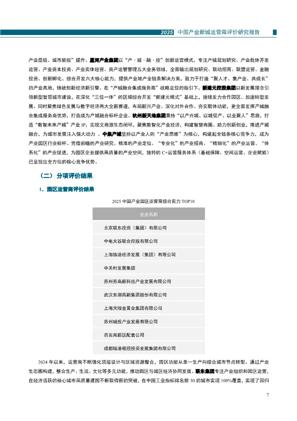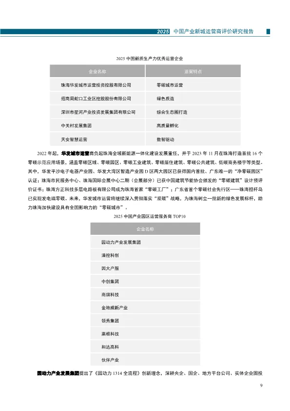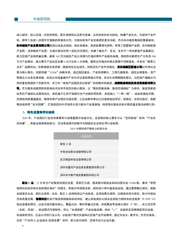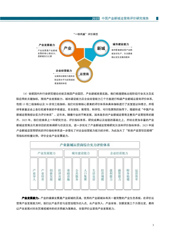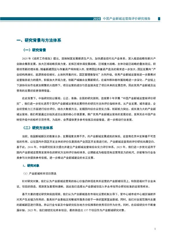 本报告基于对全国137个产业新城项目及66家运营商的深入研究,系统评价了产业新城运营商的综合实力与发展趋势。研究发现,领先运营商正从“泛化”的产业定位转向“细分”和聚焦“新质生产力”,招商模式进入“精准化、资本化、生态化”新阶段。城市建设强调从功能配套到宜居生态协同,并规模化应用绿色低碳技术。企业经营呈现“轻重并举”趋势,即重资产聚焦核心,轻资产深化服务与品牌输出。报告为政府、业界提供了产业定位、招商策略、产城融合及企业运营等方面的宝贵经验与参考。