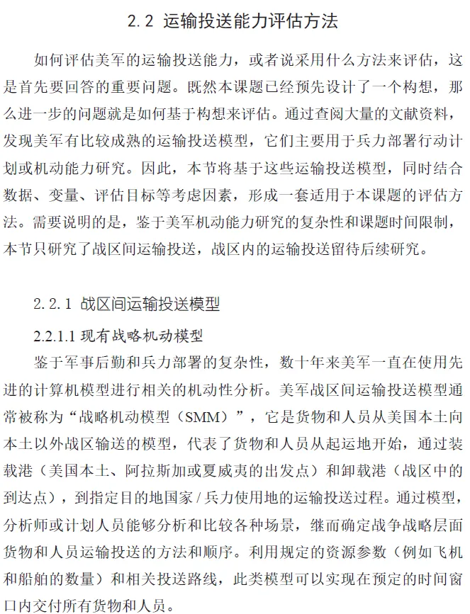 在评估方法方面,战略空中投送和空中加油能力评估都借鉴了美军现行的评估方法。例如,战略空中投送能力评估参考美国国防部《机动能力需求研究-2016》模型,并以“九步法”分析流程为基础,先是形成了简化的分阶段兵力与部署数据(TPFDD)文件,然后通过数学建模,建立了一个适用于兵力部署场景的战略空运模型。