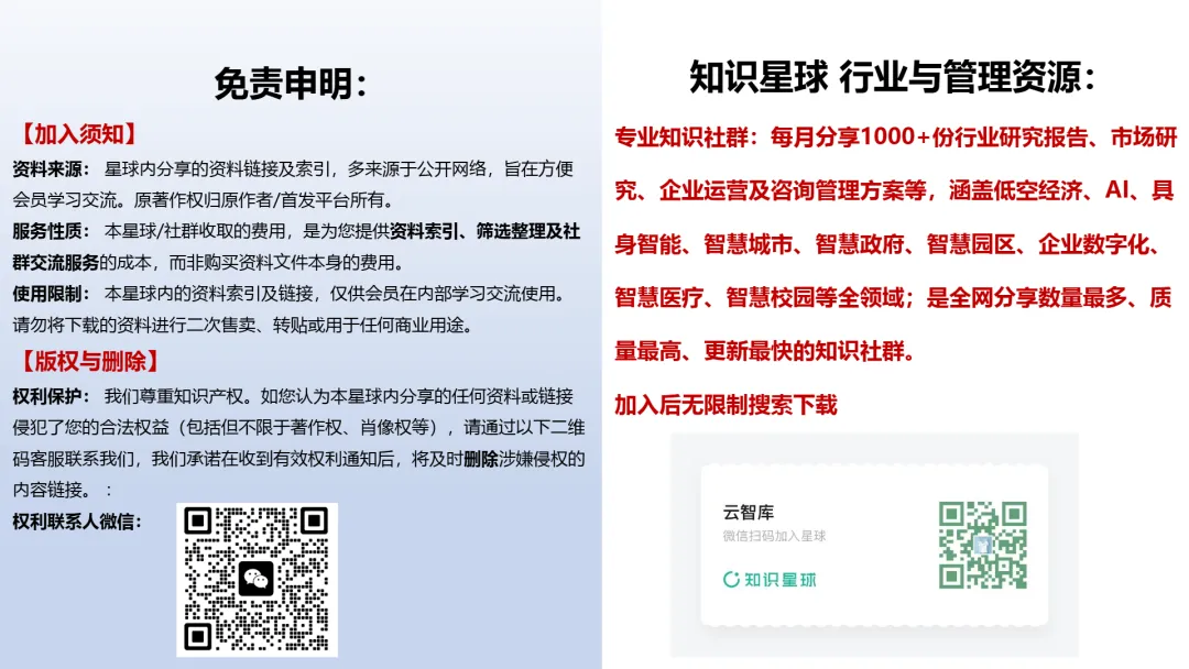 2.星球成员点击链接:智慧星球或扫描下方二维码进入智慧城市星球智库,获取下载近万份Wrod、PPT方案(可编辑文件)、行业报告、地方数字化政策、招标资料等资料。