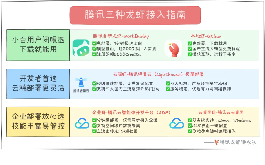 针对普通个人用户,腾讯推出 WorkBuddy 和 QClaw 两款零门槛产品:WorkBuddy 作为 “免部署小龙虾”,支持 Windows/Mac 双系统,兼容 OpenClaw 全量技能包,无需环境配置即可实现多 Agent 并行,下载即送 5000 Credits 体验补贴;QClaw 处于内测阶段,主打微信远程操控功能,用户可通过手机微信发送指令,实现电脑文件处理、数据计算等操作的远程执行与结果回传。