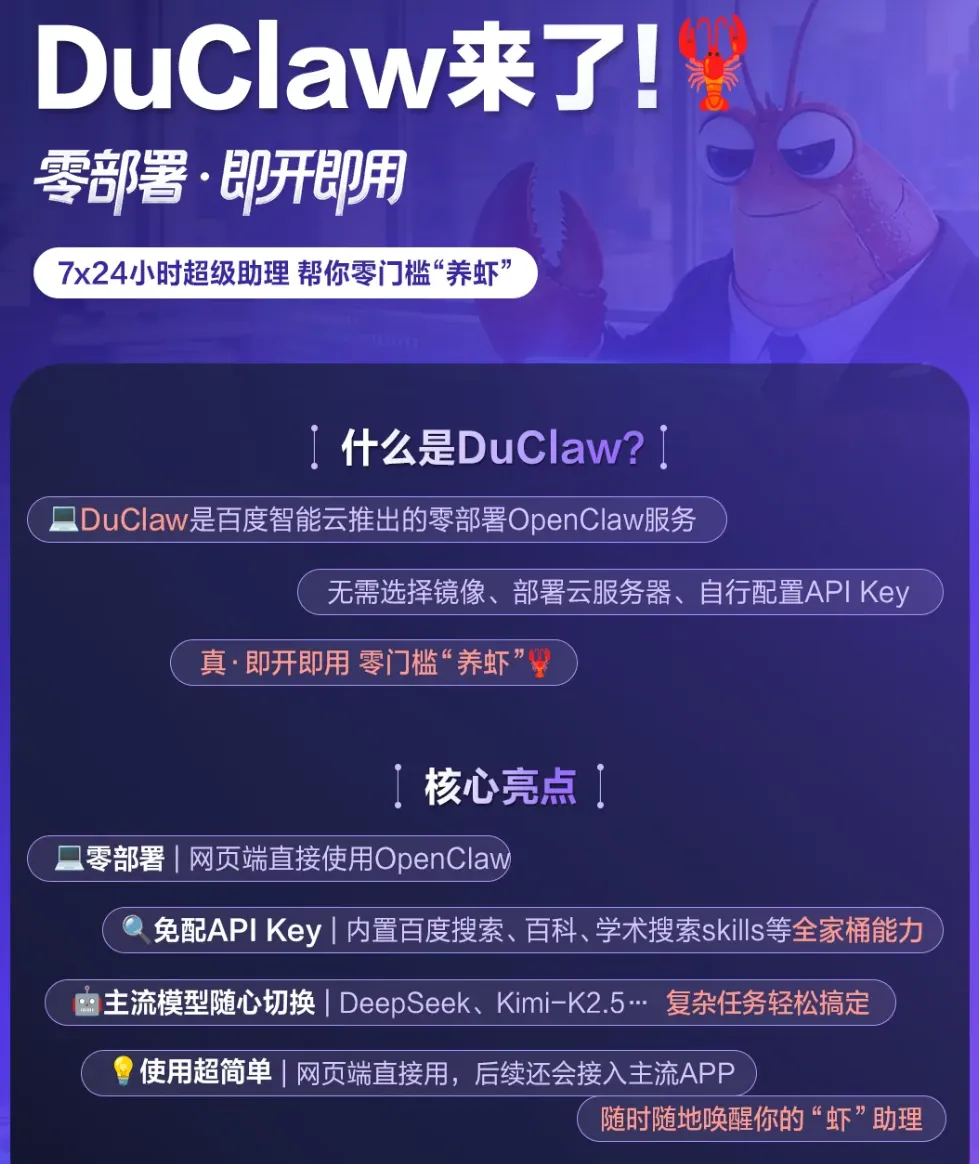 2026 年 3 月 11 日,百度智能云正式发布零部署 OpenClaw 服务 DuClaw,将 OpenClaw 的使用门槛从 “一键部署” 进一步简化至 “零部署”,用户无需配置服务器镜像、部署云端环境或手动设置 API Key,订阅后即可通过网页端直接使用完整服务,真正实现零门槛 “养虾”。同日,百度在科技园举办北京首场 “龙虾” 市集活动,数十名工程师为近千名用户提供一对一免费云端安装服务,现场解答技术疑问。