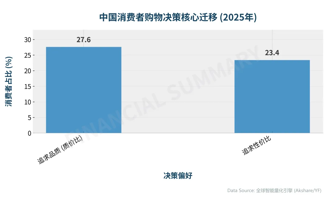 最近几年,社交媒体上最火的词,一个是“消费降级”,一个是“精致抠”。听起来好像大家都不花钱了,准备勒紧裤腰带过冬。但你要是真这么想,那就把事情看简单了。你去超市看看,货架末端的临期牛奶,总有年轻人在那挑挑拣拣;但转个弯,进口水果区那些几十块一斤的阳光玫瑰葡萄,照样有人整箱整箱地往购物车里搬。这就是最真实的写照:今天的消费者,活成了一个“K型”的人。什么叫“K型”?就是在一本账本上,活出了两种人生。在那些满足基础生理需求、没啥情绪价值的“标品”上,他们能省则省,成了最精明的价格捕手。比如买酱油,以前可能认准某个牌子,现在谁家做活动、谁家量大价优就买谁。这解释了为什么今天盘面上,食品、服装这些必需品板块表现平平,甚至有点回调。因为在这片战场,价格战的刺刀已经见红了。▲ Data Insight: 酿酒行业在消费板块中涨幅领先,表现出较强的市场韧性,而服装和食品等部分必需消费品则出现小幅回调,反映出板块内部的显著分化。但K字的另一头,是向上的。在那些能提供情绪价值、能满足“悦己”需求、能作为社交货币的东西上,他们花起钱来,比谁都大方。一瓶好酒,喝的不是酒精,是朋友聚会时的气氛,是犒劳自己辛苦一周的仪式感。所以,酿酒行业为啥能在消费板块里一枝独秀?因为它卖的早就不是乙醇和水了。华尔街的分析师们喜欢画各种增长曲线,预测未来五年的复合增长率。但在我看来,还不如去看看晚上十点的海底捞,还有多少人在排队;或者去小红书上搜搜,有多少女孩在讨论一支新出的三百块的口红。这背后是一个根本性的变化:追求品质的消费者,人数上已经超过了只看重性价比的群体。大家不是不买,而是不再为平庸的东西付钱了。▲ Data Insight: 截至2025年,追求高品质的消费者占比已首次超过追求性价比的群体,标志着中国市场正从价格驱动全面转向价值驱动的‘质价比’新时代。从“买得到”到“买得值”—— 不再为平庸买单