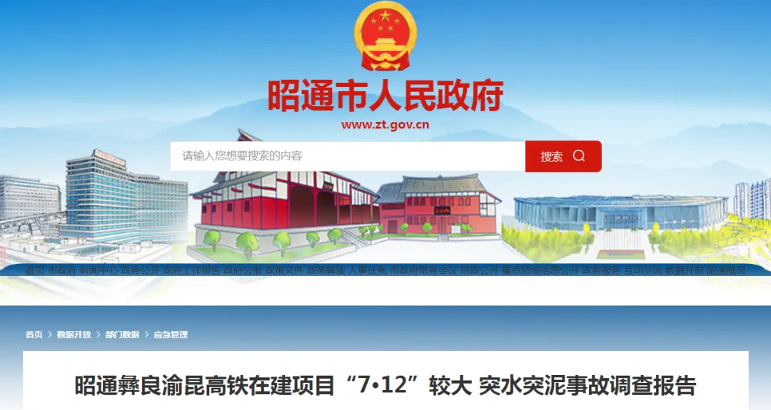 3月16日,昭通市应急管理局16日公布了一起较大突水突泥事故的调查报告,建议对12名责任人进行责任追究。2025年7月12日12时10分许,昭通市彝良县境内在建的重庆至昆明高速铁路云贵段昭通隧道3号横洞8#横通道正洞大里程作业面发生一起突水突泥事故,造成7人死亡、4人受伤。
