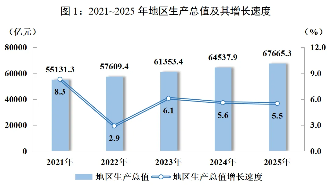 根据地区生产总值(GDP)统一核算初步结果,2025年四川省地区生产总值67665.3亿元,按不变价格计算,比上年增长5.5%。其中,第一产业增加值5751.4亿元,增长3.7%;第二产业增加值23260.2亿元,增长4.9%;第三产业增加值38653.8亿元,增长6.1%。三次产业结构为8.5∶34.4∶57.1,三次产业对经济增长的贡献率分别为6.7%、31.6%和61.7%。人均地区生产总值81124元,增长5.8%。
