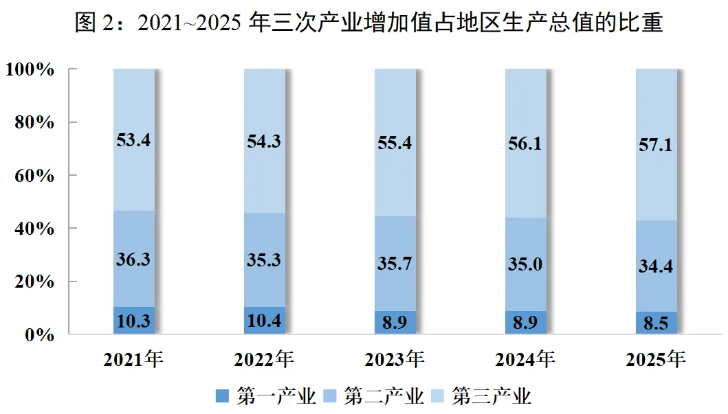 2025年,民族自治地方(包括阿坝藏族羌族自治州、甘孜藏族自治州、凉山彝族自治州和北川羌族自治县、峨边彝族自治县、马边彝族自治县)地区生产总值4126.0亿元,比上年增长5.7%。其中,第一产业增加值781.0亿元,增长3.9%;第二产业增加值1289.5亿元,增长6.1%;第三产业增加值2055.5亿元,增长6.2%。三次产业结构为18.9∶31.3∶49.8。