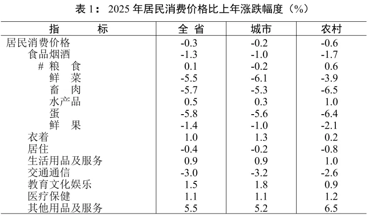 全年居民消费价格比上年下降0.3%,其中医疗保健类上涨1.1%,居住类下降0.4%,教育文化娱乐类上涨1.5%,食品烟酒类下降1.3%。工业生产者出厂价格比上年下降2.8%,其中生产资料价格下降3.0%,生活资料价格下降2.2%;工业生产者购进价格比上年下降3.6%。