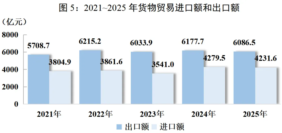 全年货物贸易进出口总额10318.1亿元,比上年下降1.3%。其中,出口额6086.5亿元,下降1.5%;进口额4231.6亿元,下降1.0%。