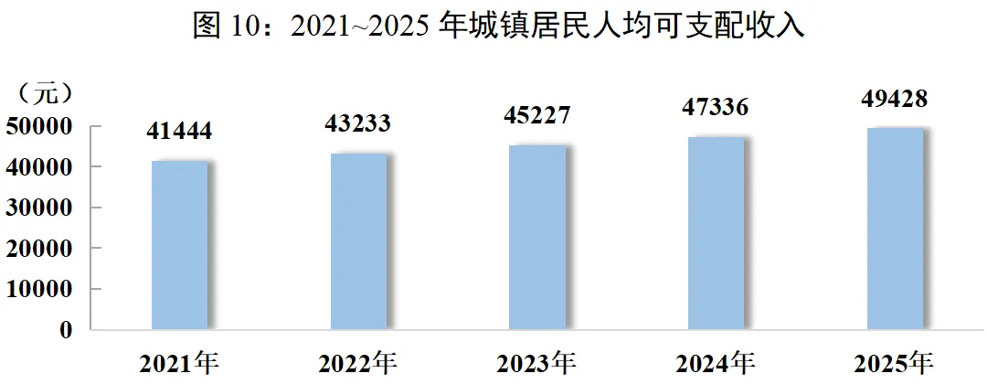按常住地分,城镇居民人均可支配收入49428元,比上年增长4.4%。其中,工资性收入29016元,增长5.4%;经营净收入5834元,增长5.6%;财产净收入3401元,下降6.0%;转移净收入11177元,增长4.8%。城镇居民人均消费支出32181元,增长4.2%。八大类消费中,教育文化娱乐等支出增长较快。其中,城镇居民人均生活用品及服务支出增长9.6%,交通通信支出增长8.9%,教育文化娱乐支出增长10.3%。