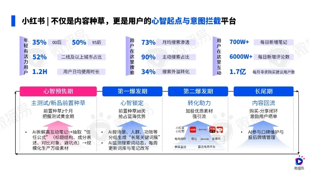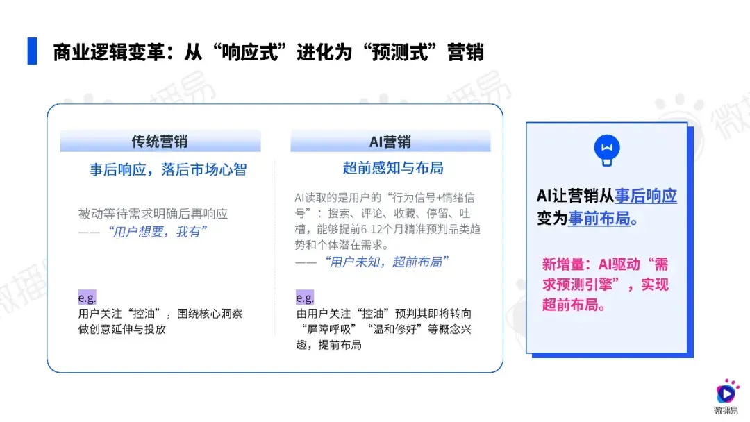 AI 为快消营销带来从响应式到预测式的变革,能提前预判消费需求,实现心智占位。小红书、B 站、抖音等平台各有定位,品牌可借助 AI 完成各平台的内容布局与全域协同,从意图拦截、知识背书到规模化放量、话题引爆形成完整营销链路,精准触达用户。
