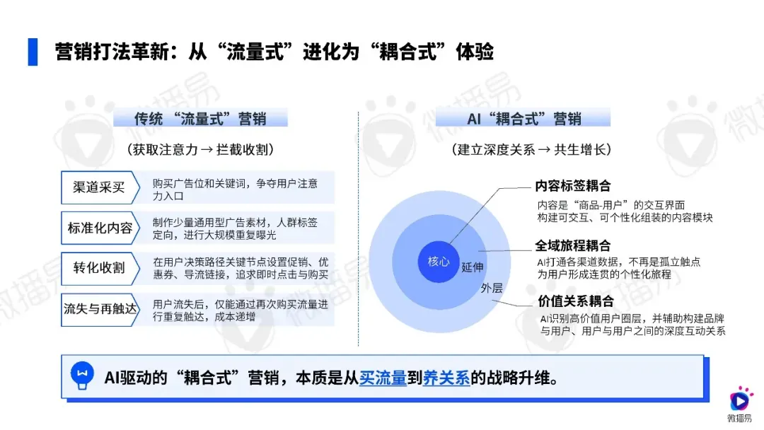 AI 推动快消内容营销走向工业化,以标签思维构建可复用的数字资产,通过小额测试找到商品与用户标签的有效组合,再进行规模化复制、心智巩固与持续迭代,同时以重内容锚定品牌心智,轻内容实现精细化沟通,适配新品全生命周期的营销需求。