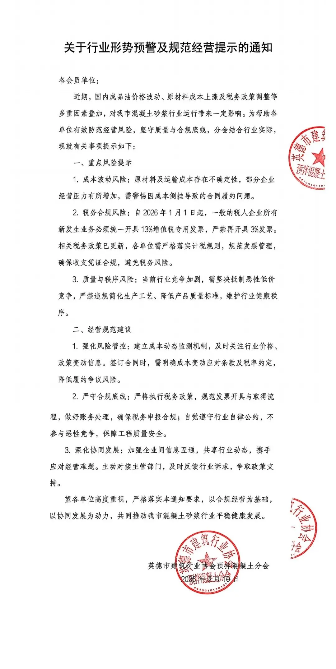 关于行业形势预警及规范经营提示的通知