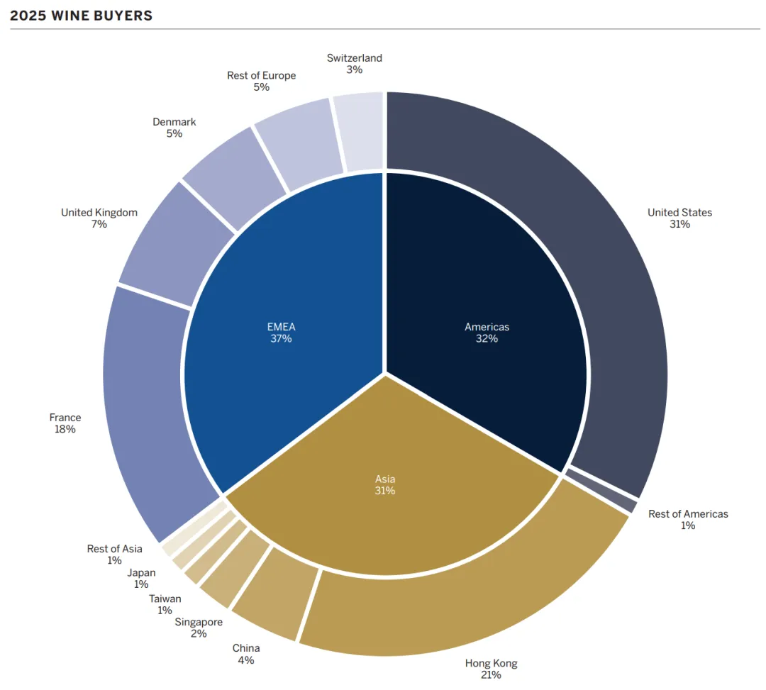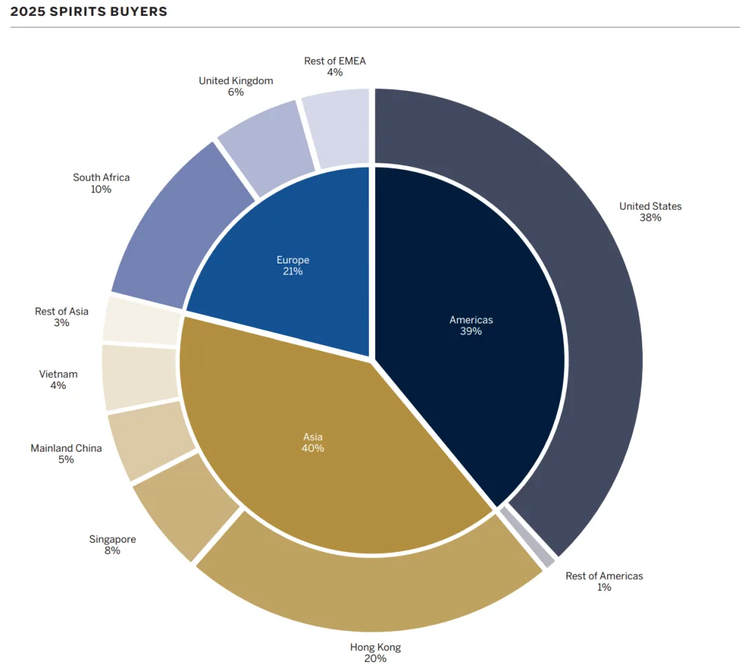 2025年的另一大显著特征是烈酒买家分布更加平衡,曾经明显占据主导地位的亚洲买家群体已与美洲平分秋色,EMEA(欧洲、中东和非洲)地区的参与度也明显提高,其所占份额同比翻了两倍。