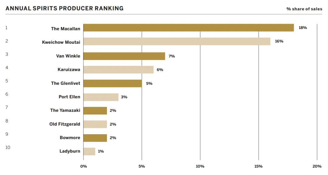 在品牌表现上,成交额最高的十大烈酒品牌分别为麦卡伦、茅台、Van Winkle、轻井沢、格兰威特、波特艾伦、山崎、Old Fitzgerald、波摩和Ladyburn。其中麦卡伦以18%的份额连续第五年蝉联榜首,茅台则以16%的份额紧随其后,两者合计占到了总成交额的三分之一。