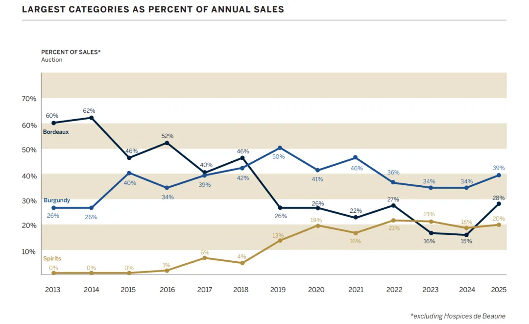 2025年葡萄酒二级市场各产区间的成交并不平衡,波尔多葡萄酒的市场份额几乎是2024年的两倍,达到总销售额的28%,而勃艮第葡萄酒仍然以39%的销售额领先。