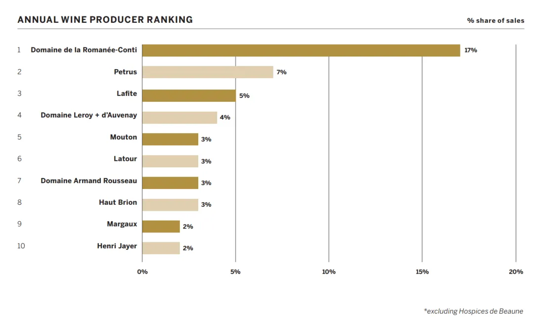 2025年成交额最高的十大葡萄酒品牌中,波尔多占据主导地位,反映出该产区的复兴之势。罗曼尼·康帝酒庄依旧以绝对优势遥遥领先,帕图斯和拉菲的份额增长超100%并分列二三位。木桐酒庄和拉图酒庄也大幅增长,而Haut-Brion和玛歌则进一步巩固了波尔多在高端市场的主导地位。