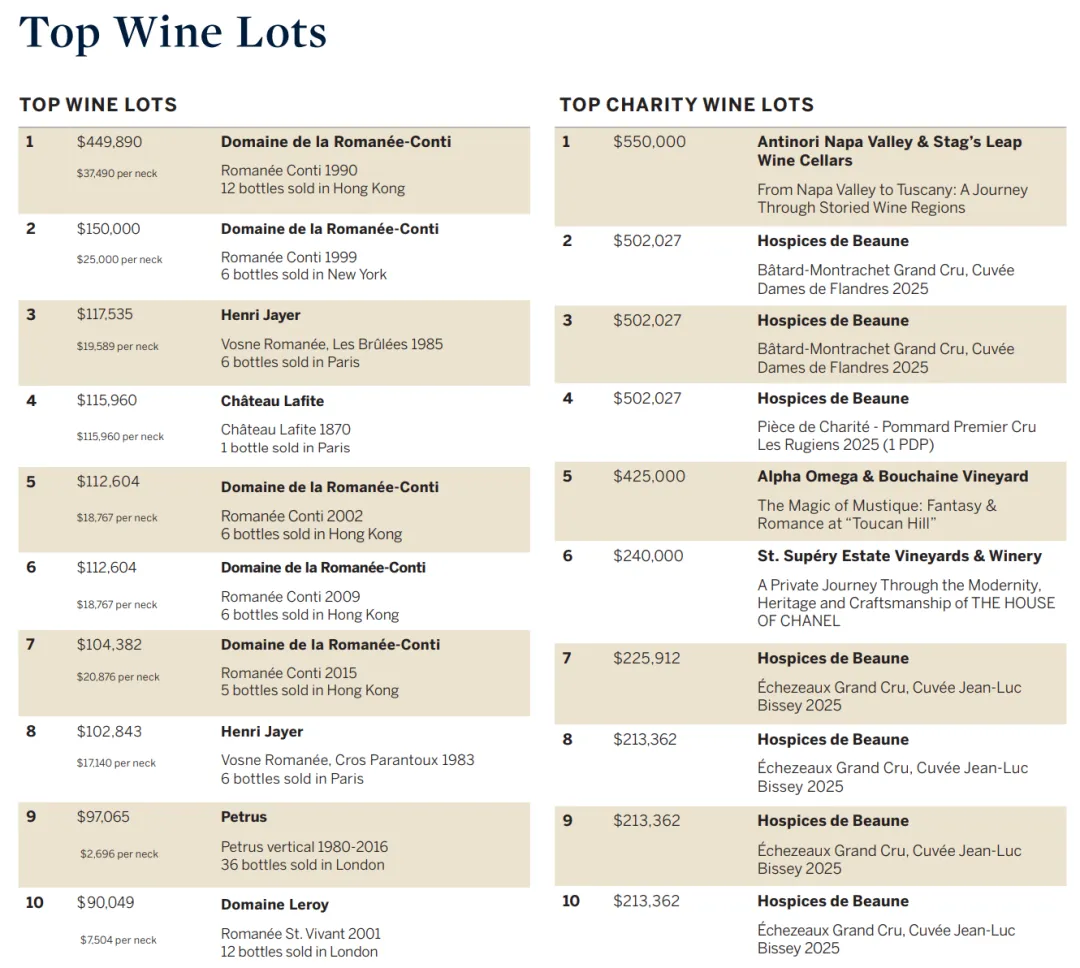 2025年葡萄酒拍卖价格TOP 10与慈善拍卖TOP 10: