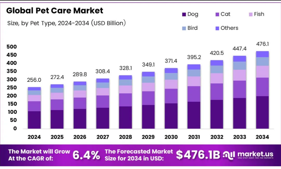 全球宠物护理2025年273.42亿美元,2026年289.17亿美元,到2034年496.75亿美元,CAGR 7.75%。中国宠物消费2025年312.6亿人民币,2026年341亿,到2028年405亿,CAGR 8.3%。宠物科技2025年15.6亿美元,2026年19.1亿美元,到2035年52.9亿美元,CAGR 12%。宠物食品全球2025年109.3亿美元,2026年115亿美元,CAGR 5.2%;用品2025年62.3亿美元,2026年66.5亿美元,CAGR 6.8%。