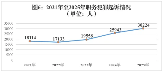 5. 协同推进反腐败斗争不断深化。起诉职务犯罪30224人[5],同比上升16.6%(见图6)。依法严惩重点领域和群众身边腐败犯罪,起诉工程建设和招投标领域2852人、医疗领域1806人、教育领域1788人、金融领域1555人、能源领域1173人。