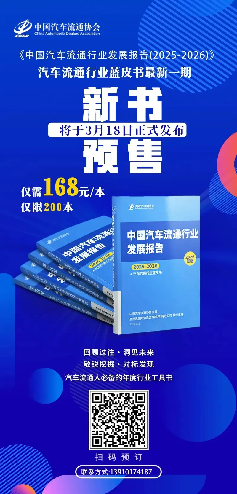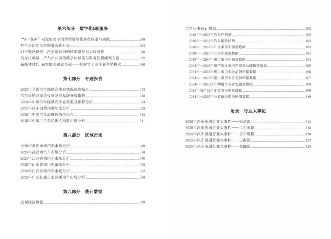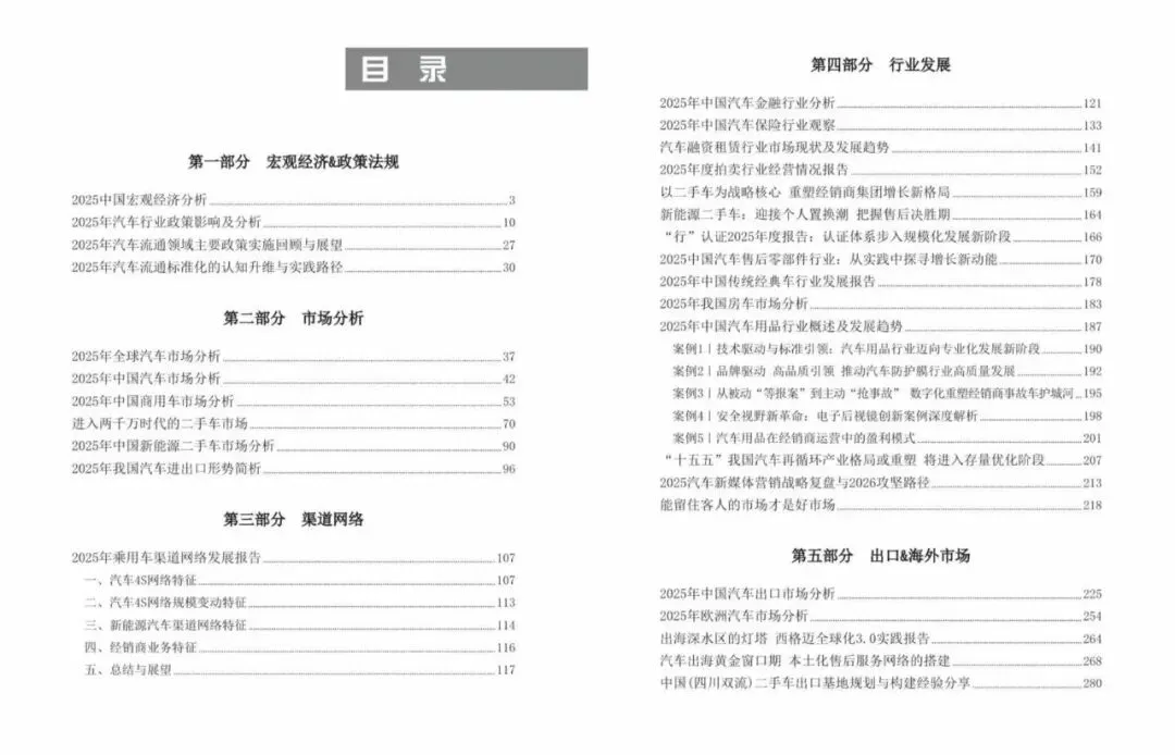 2010年至今,《中国汽车流通行业发展报告》已连续发行十六年, 通过系统展现每一年中国汽车流通行业发展的最新状况,发展特点和变化趋势,分析研究行业热点问题,总结优秀企业发展的先进经验和优秀案例,《报告》已成为业内最具影响力的刊物之一,成为启迪行业创新、把握行业动向的重要工具。最新一期《中国汽车流通行业发展报告(2025-2026)》于2026年3月18日正式发布,即日起开始预售。《中国汽车流通行业发展报告(2025-2026)》本年度报告共包九大板块:汽车流通行业年度报告、政策法规、市场分析、行业发展、区域市场、调查发现、出口&海外市场、数字化&新服务、统计数据。对2025年度汽车流通领域的发展情况进行全面总结,满足汽车行业从业者及服务机构对汽车流通领域发展情况的关注。除了有更多省市流通协会加入撰稿,提供当地汽车流通市场的发展状况介绍外,流通协会各分支机构也提供了更多对其专业领域的深度解析。《中国汽车流通行业发展报告2025-2026》目录《中国汽车流通行业发展报告(2025-2026)》于3月18日正式发布,即日起开始预售限时优惠,数量有限,有意向购买者可扫描文章底部二维码。