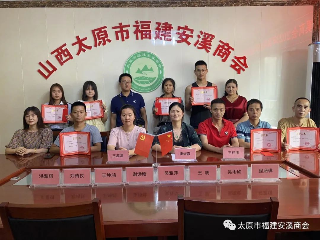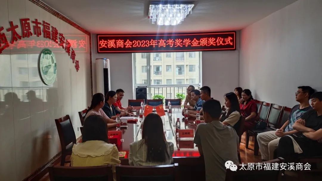 8月22日下午,太原市福建安溪商会2023年高考奖学金颁奖仪式在商会会议厅圆满举行。太原市福建安溪商会会长廖淑霞,执行会长王淑清,监事长王桂明、本年度高考考取优异成绩的会员优秀学子及其家长代表等参加颁奖仪式并进行座谈交流。