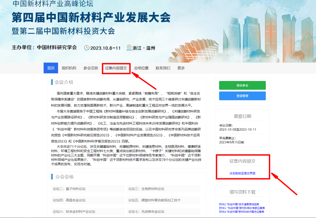 以上内容由各论坛组织开展征集工作,截止时间以分论坛通知为准。相关内容将列入大会程序手册供参会代表参考。参会代表可直接在大会官网提交成果摘要、技术清单等相关内容。提交位置如下图: