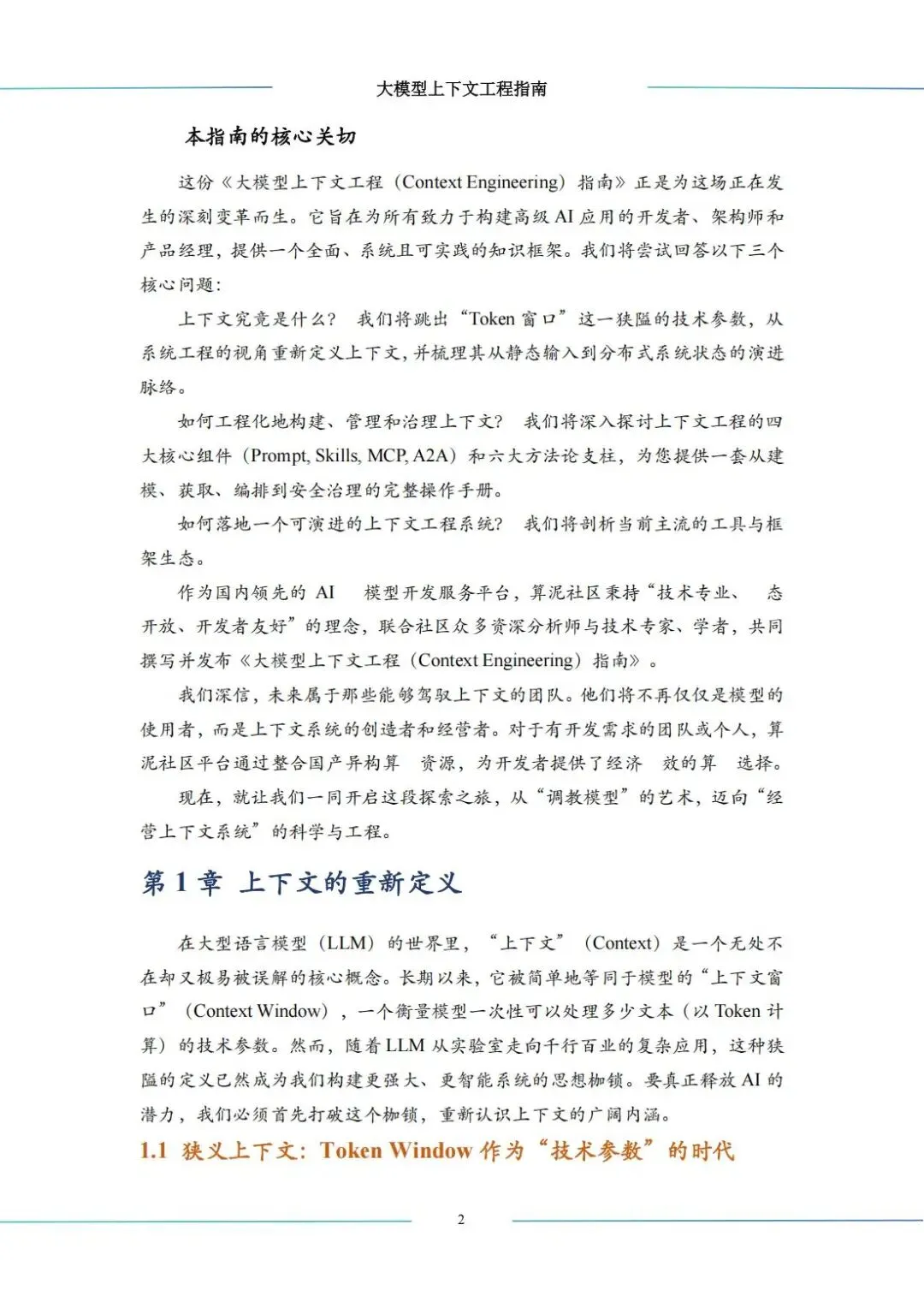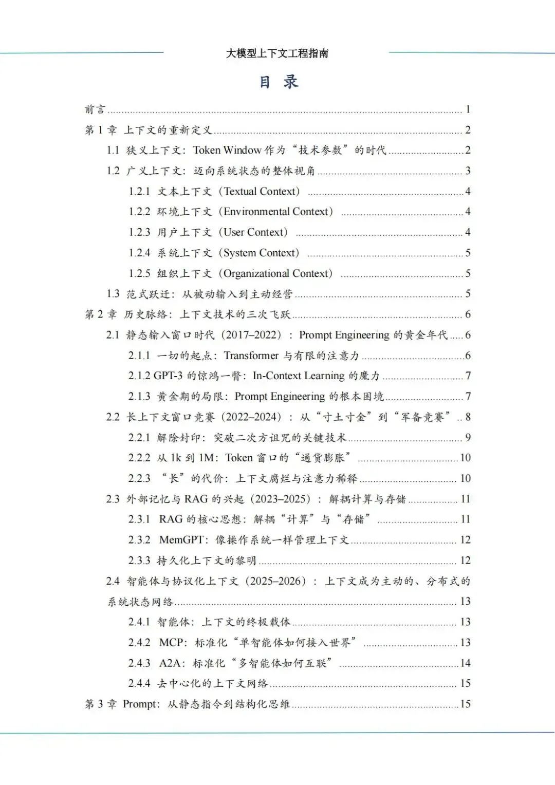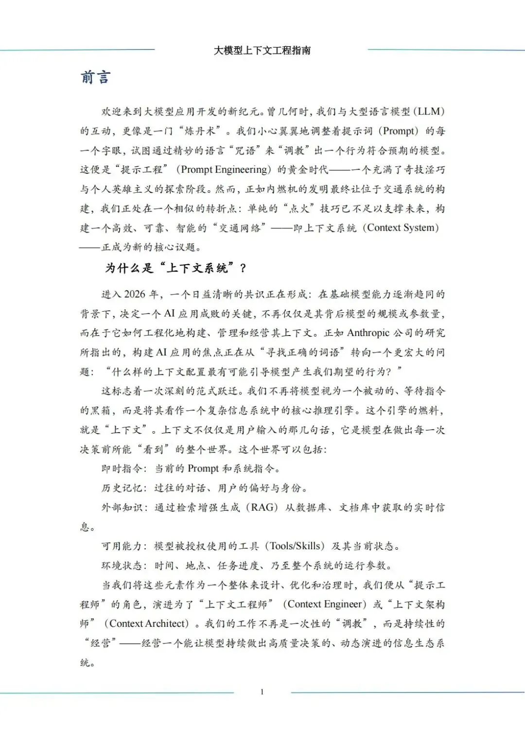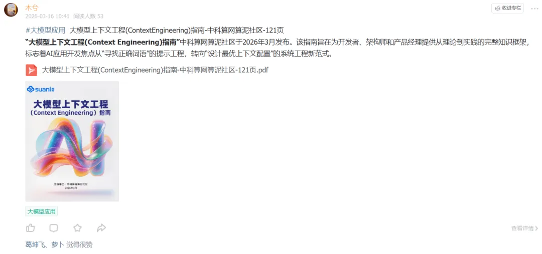 “大模型上下文工程(Context Engineering)指南”中科算网算泥社区于2026年3月发布。该指南旨在为开发者、架构师和产品经理提供从理论到实践的完整知识框架,标志着AI应用开发焦点从“寻找正确词语”的提示工程,转向“设计最优上下文配置”的系统工程新范式。公号后台回复“9”,在AI大模型·领地知识星球查看~如欲查看完整版文件,请扫描下方二维码加入“AI大模型·领地”获取。说明:本文部分文字与图片资源来自于网络,分享此文是出于传递更多信息之目的,若有来源标注错误或侵犯了您的合法权益,请立即后台留言通知我们,情况属实,我们会第一时间予以删除,并同时向您表示歉意。AI大模型·资料·藏经阁