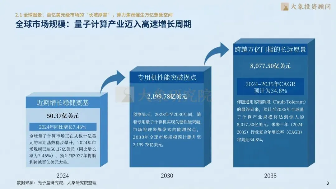 洞察量子计算发展趋势,推动商业价值高效转化,大象投顾锚定新质生产力核心赛道,以专业洞见赋能产业跃迁,以前瞻视野解锁发展新局——量子计算,开启未来无限可能,我们愿与优秀企业并肩同行,提供全方位的全球化咨询及资本服务。