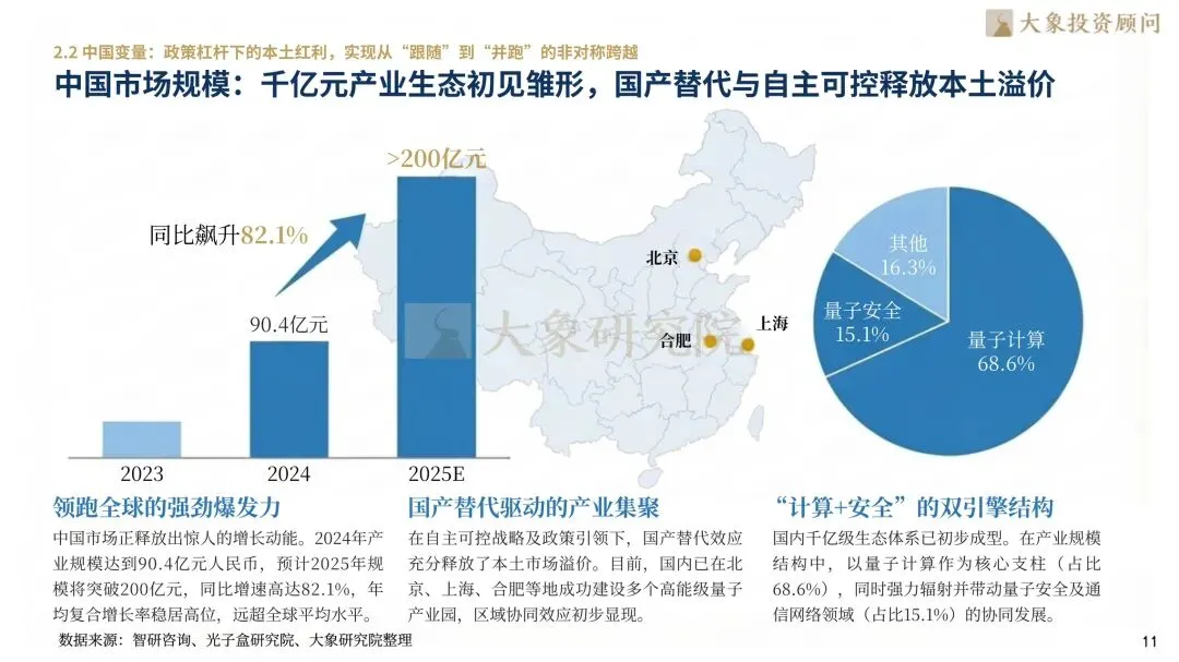 全球量子计算市场规模已步入爆发式增长周期。2024年,全球量子计算市场规模约为50.37亿美元,预计2027年将跨过百亿美元大关;到2030年专用量子机实现成熟应用时,市场规模将飙升至2,199.78亿美元。中国市场展现出更为强劲的增长爆发力,在国家战略持续赋能下,2024年量子计算市场规模达90.4亿元人民币,预计2025年将突破200亿元大关,同比增速高达82.1%。目前国内已形成以量子计算为核心(占比68.6%)、辐射量子安全与量子通信的产业生态格局,彰显出极强的自主可控发展驱动力与广阔商业潜能。